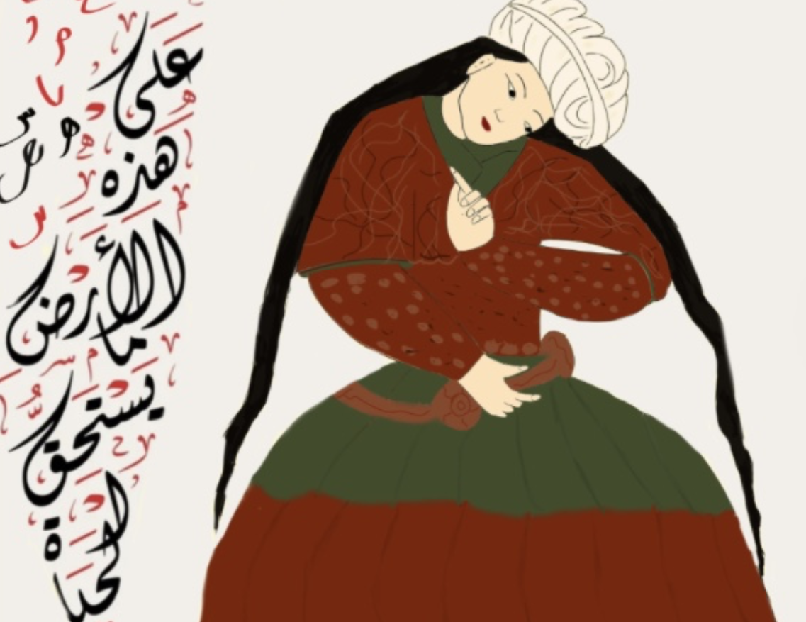 This artwork explores the deep connection between identity and language. The figure, dressed in traditional attire, leans in quiet contemplation while Arabic calligraphy which talks about the importance of woman is apparent. The piece reflects the emotional weight of language, the power of self-expression, and the lasting influence of cultural heritage, emphasizing how art can preserve and honor the traditions that shape us.
