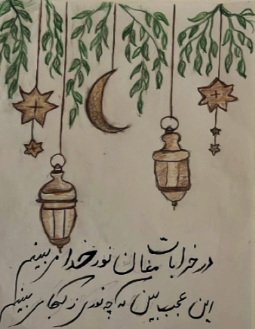 Ancient lanterns from Islamic countries are crafted with neutral colors like beige and bronze. These lanterns provide a calming light and showcase intricate designs. The calligraphy in this artwork matches this style, with an elegant, flowing script that complements the lantern’s colors and patterns. This is an important piece of the ancient times in islamic countries where electronics were not a thing and the writing talking about the importance of light.