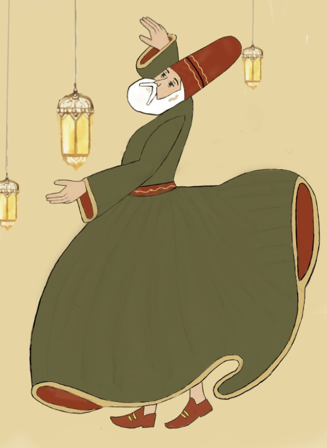This digital artwork shows a Sufi whirling dervish in a graceful, spinning pose, symbolizing devotion and spirituality. The green robe with red and gold details represents peace, passion, and light, important in Sufi traditions. Golden lanterns add warmth and a sacred feeling, while the soft beige background creates a calm and timeless look. The smooth lines and shading bring the figure to life, showing movement and blending culture with modern digital art.