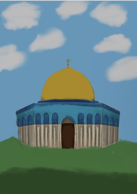 This piece of art blends cultural history with a cartoon aesthetic by combining traditional Islamic architectural components with a contemporary, cartoonish style. The piece evokes spiritual significance while remaining approachable due to its striking color scheme of gold, blue, green, and white.The artwork is both captivating and approachable because of the whimsical feeling conveyed by the bold outlines and simplistic forms which are shown by bold colors.