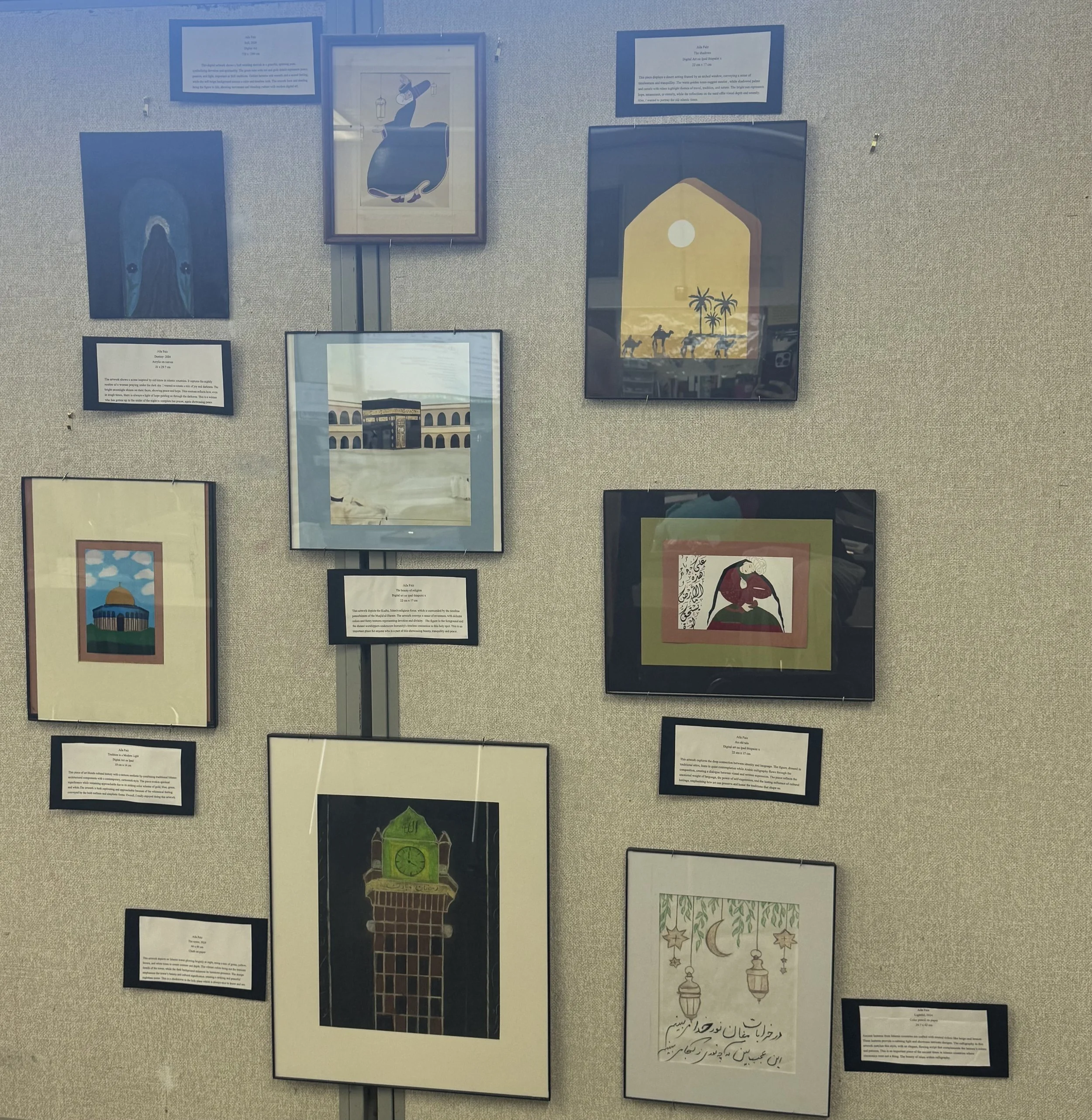 To express these ideas, I use a variety of artistic forms,painting, drawing, digital art, and Islamic calligraphy. Pencil drawings convey inner emotions and spirituality. Paintings tell stories of cultural identity through vivid colors, layered meanings, and traditional symbols. Calligraphy shows respect for sacred texts and highlights the spiritual essence of Islamic art. My digital works bridge the gap between past and present, bringing heritage into the modern world. Islamic patterns, such as geometric designs and repeated motifs, appear throughout the exhibition. These patterns represent more than decoration,they reflect core Islamic ideas of unity, balance, and the divine. They mirror a belief in harmony and interconnectedness that lies at the heart of Islamic culture. The exhibition is arranged as a journey. It begins with works focused on personal spirituality, inviting viewers to explore their inner faith. The next section highlights traditional patterns and symbols, emphasizing the historical richness of Islamic art. The middle part explores Islam’s origins and its expansion across regions, showing how the culture has evolved while staying true to its roots. These works illustrate how Islamic heritage has connected people across generations.