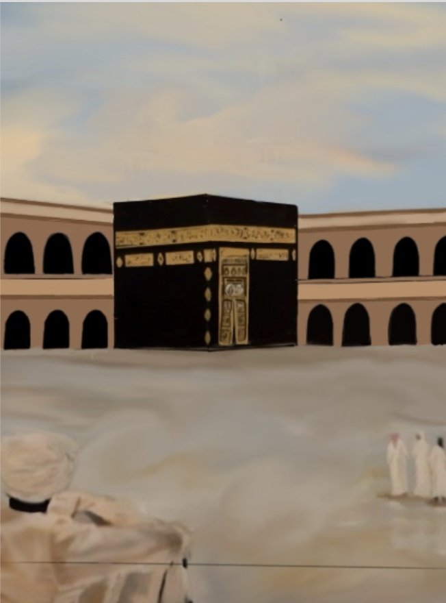 This artwork depicts the Kaaba, Islam's religious focus. which is surrounded by the timeless peacefulness of the Masjid al-Haram. The artwork conveys a sense of reverence, with delicate colors and fuzzy textures representing devotion and divinity. The figure in the foreground and the distant worshippers underscore humanity's timeless connection to this holy spot. This is an important place for anyone who is a part of this showcasing beauty, tranquility and peace.