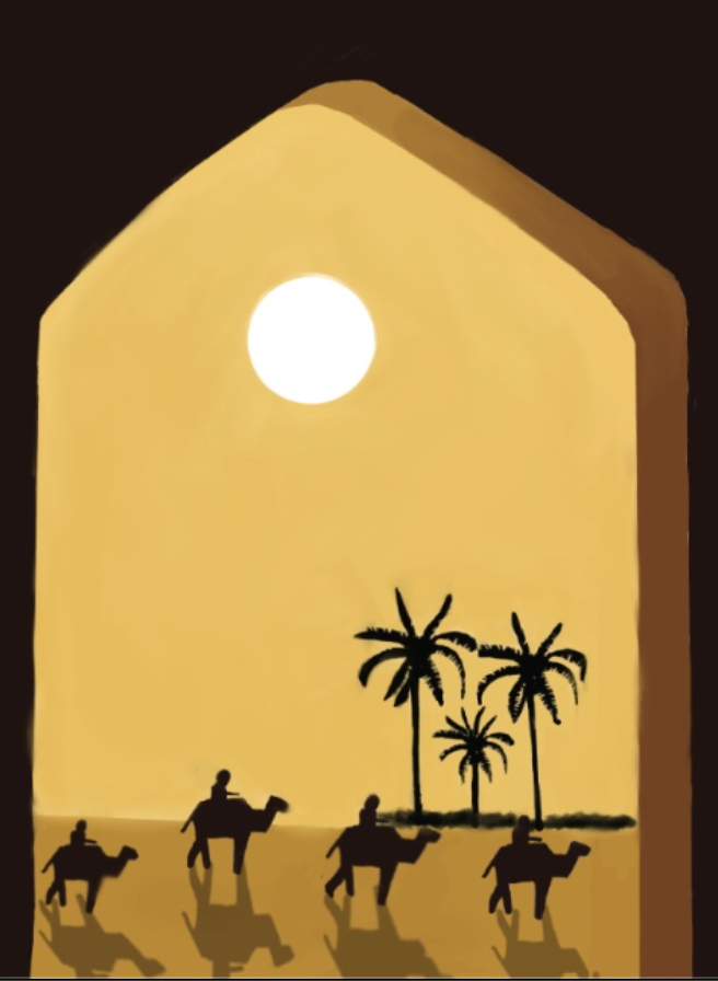 This piece displays a desert setting framed by an arched window, conveying a sense of timelessness and tranquillity. The warm golden tones suggest sunrise , while shadowed palms and camels with riders highlight themes of travel, tradition, and nature. The bright sun represents hope, amazement, or eternity, while the reflections on the sand offer visual depth and serenity. Also, I wanted to portray the old islamic times.
