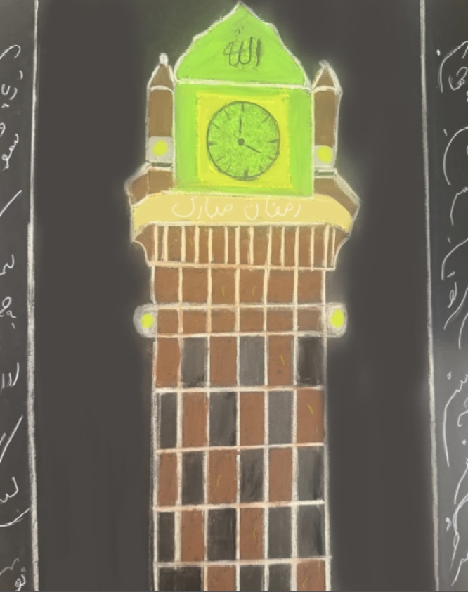This artwork depicts an Islamic tower glowing brightly at night, using a mix of green, yellow, brown, and white tones to create contrast and depth. The vibrant colors bring out the intricate details of the tower, while the dark background enhances its luminous presence. The design emphasizes the tower’s beauty and cultural significance, creating a striking and peaceful nighttime scene. This is a clocktower in the holy place which is always nice to know and see.