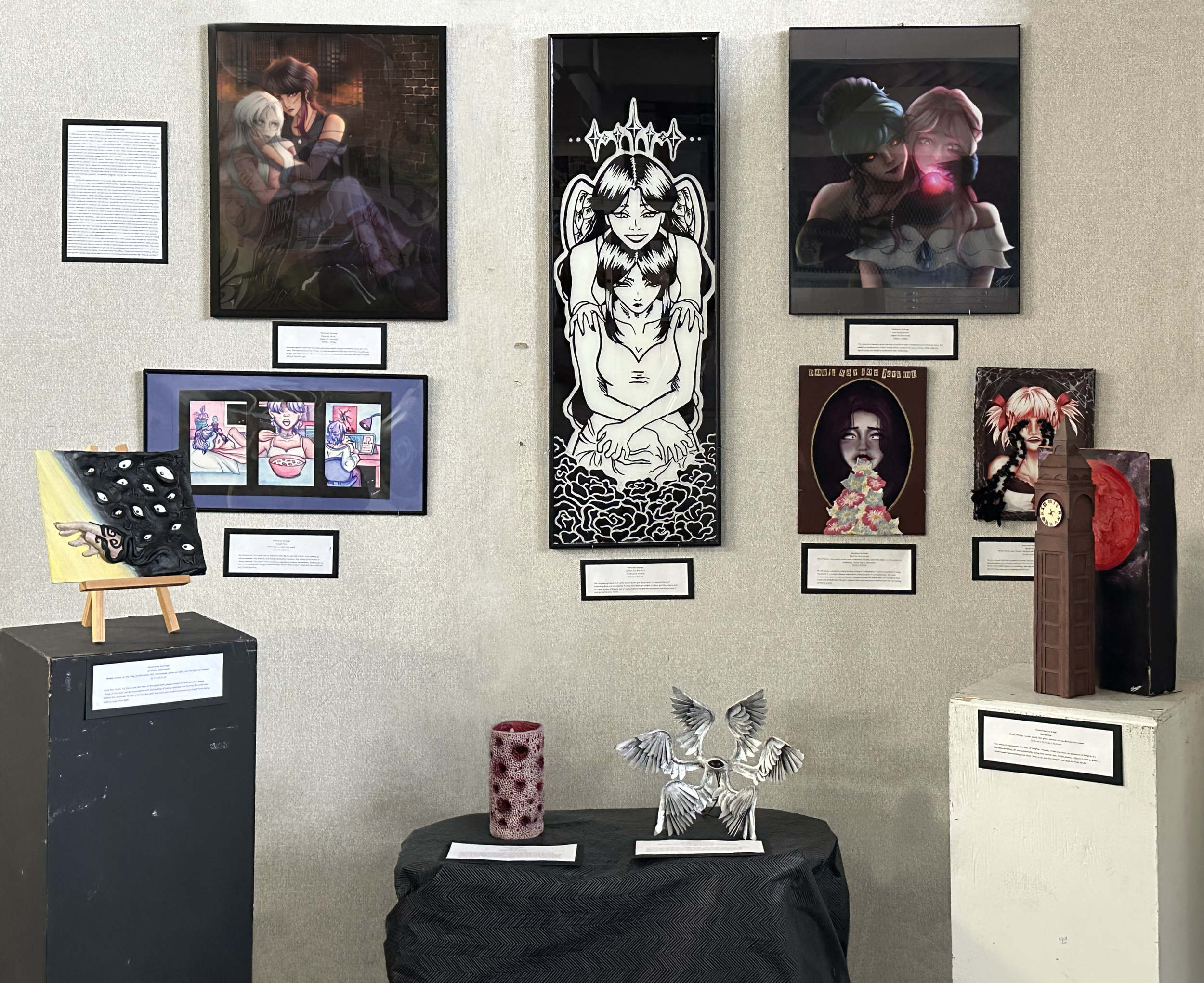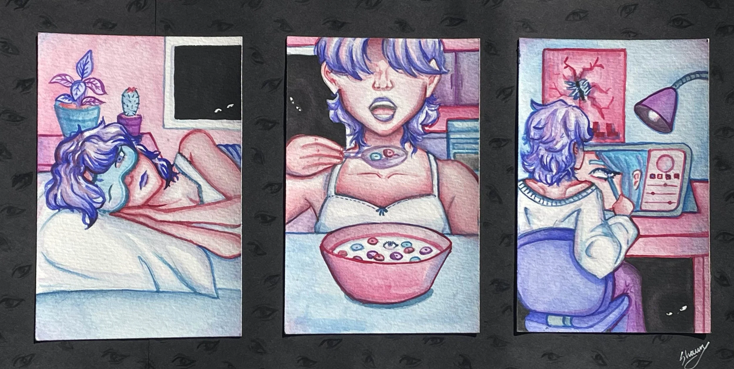 My intention for this tryptic was to depict the daily life of a girl with a twist. From waking up, eating breakfast, and drawing, she’s being watched by a shadow. This relates to my theme of “being watched”. The pastel of the scenes are supposed to contrast the shadows. Additionally, to add to the atmosphere, the girl’s eyes are never shown while an eye is integrated into a different part of each painting.