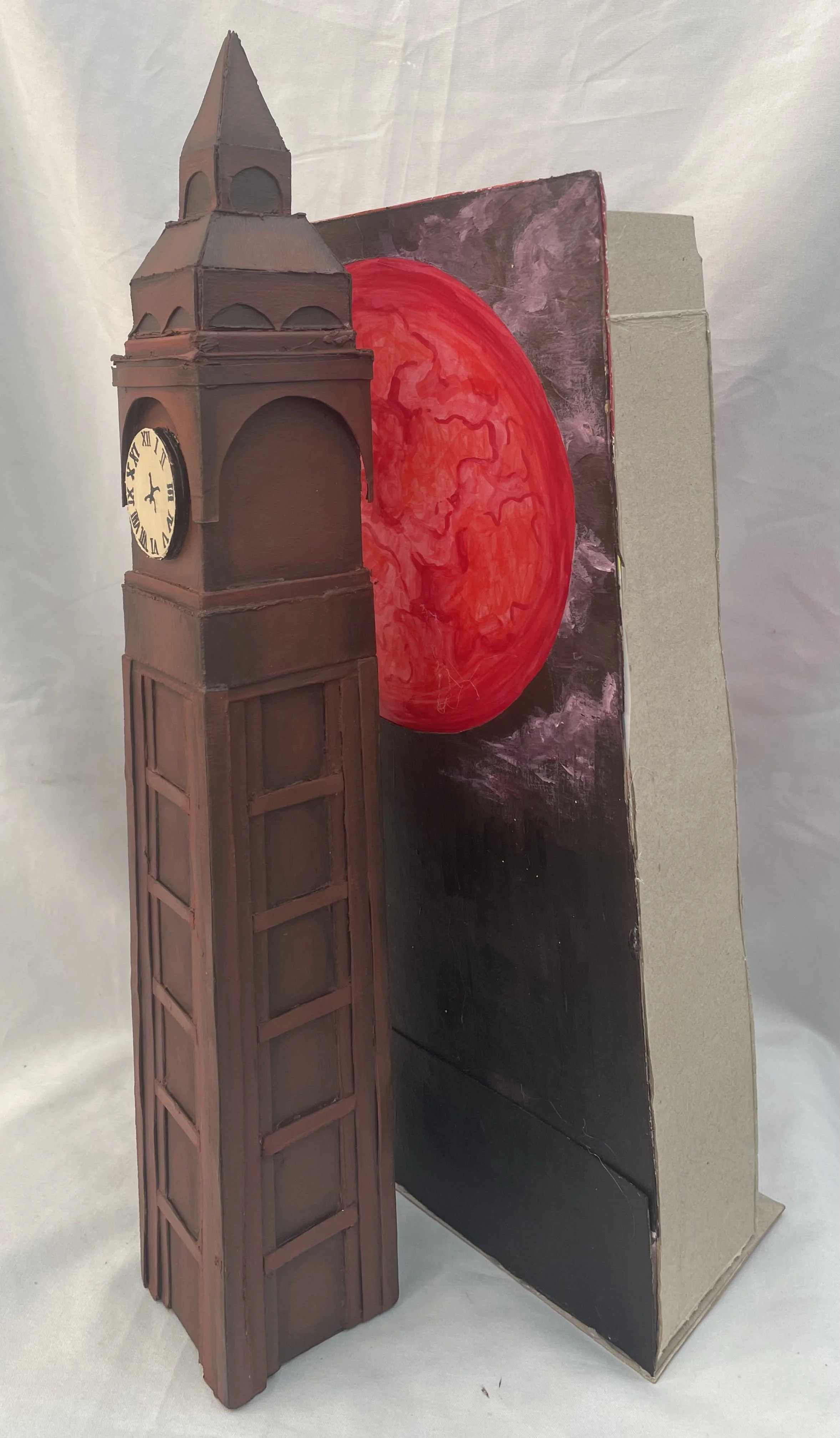 This artwork represents the fear of heights. Usually, when you have an aversion of heights it’s the idea of falling off and potentially dying that scares you. In this piece, a figure is falling down a clock tower representing how their time is up and the heights will lead to their death.