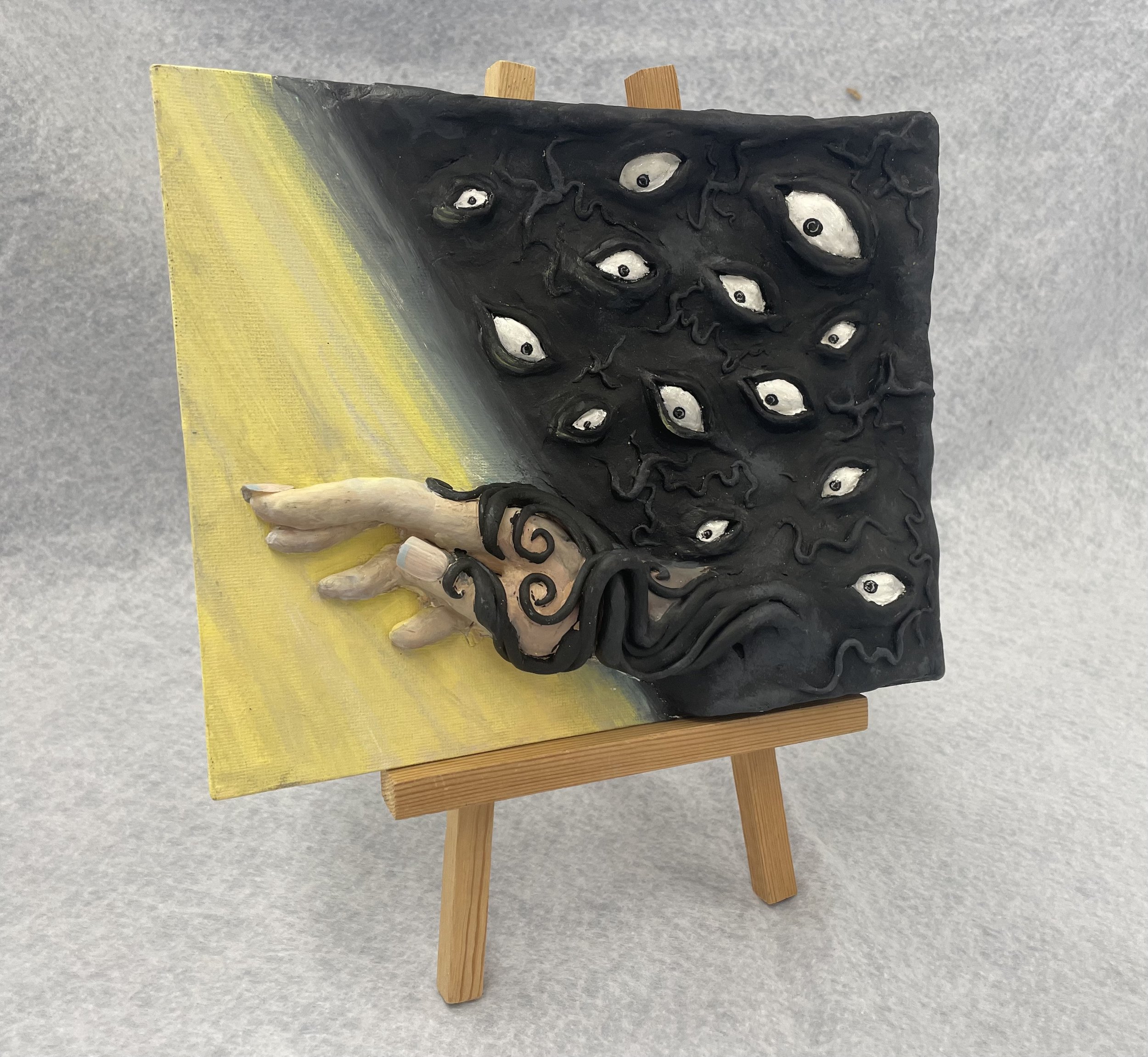 Mixed media; air dry clay, acrylic paint, foil, newspaper, press-on nails, and hot glue on canvas