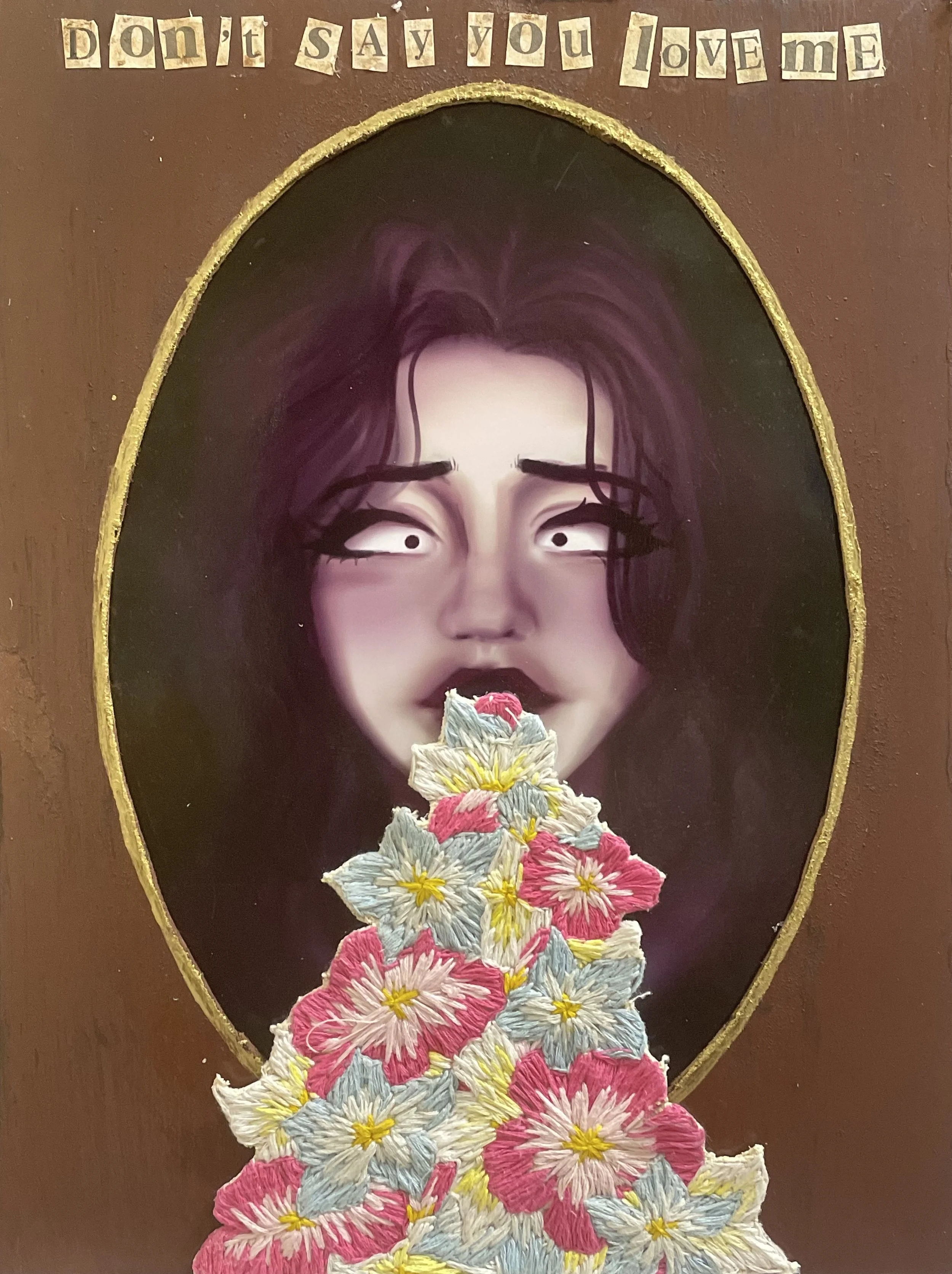 Mixed Media; spray paint, acrylic paint, embroidery thread, watercolor, digital art (Procreate) on cardboard, , canvas fabric, newspaper,