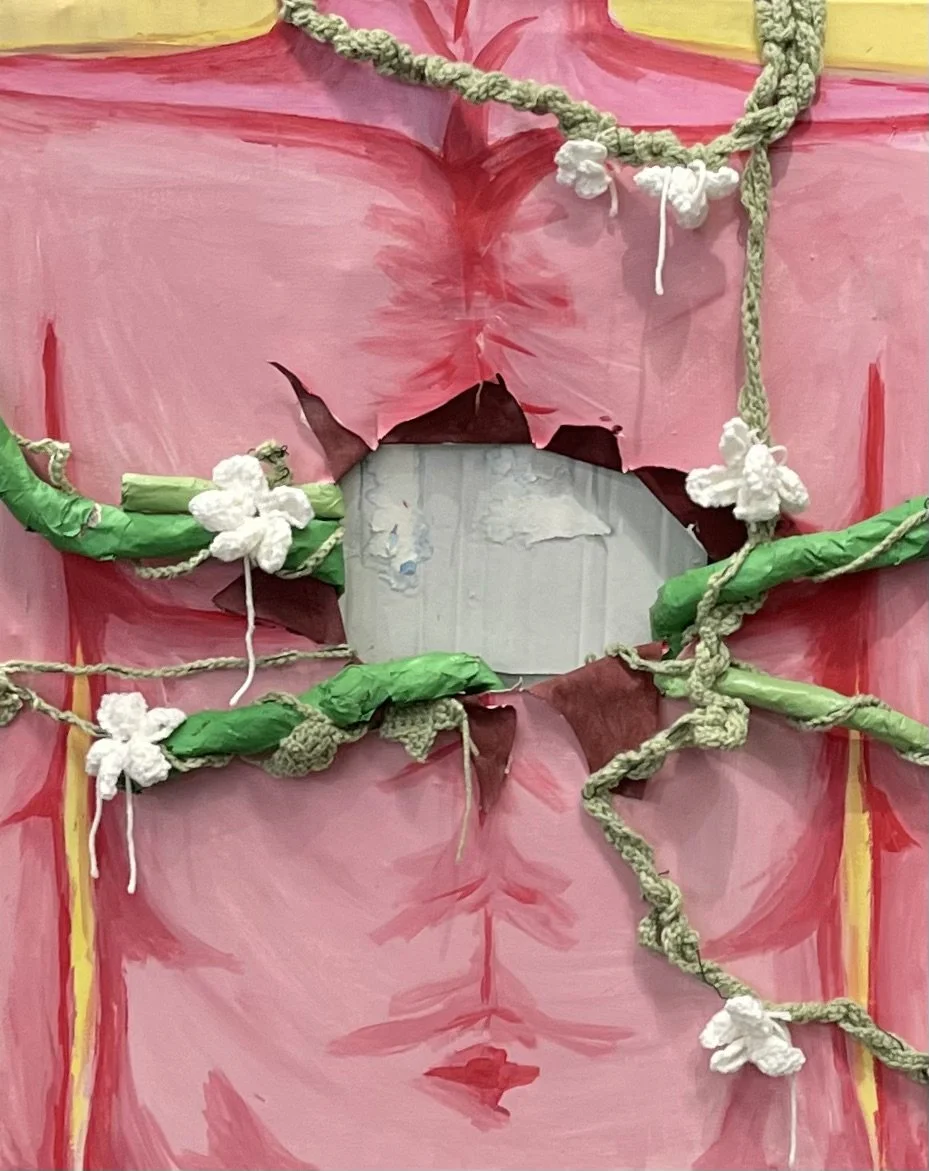 Acrylic paint, Paper Mache, Crocheted Green/White yarn, green wire, pink construction paper, and tape