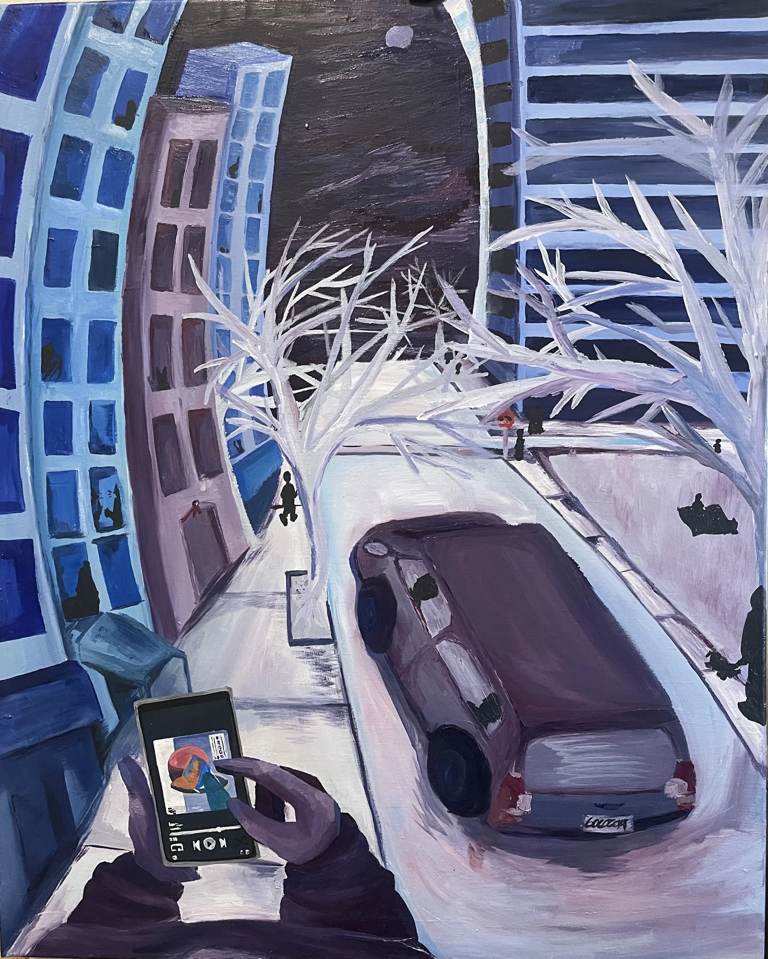 “Long Walk” follows the theme of change in man over time, represented through the 4 seasons: Winter, Fall, Summer, and Spring. The piece uses oil and Acrylic paint to depict a man walking through the city during Winter. In the piece, we see the nightlife of the city: people doing their own thing, nature being untouched, semi-crowded streets, etc. The first-person point-of-view is to portray that although we live life to the fullest, there are moments of peace/quiet. These are those moments.