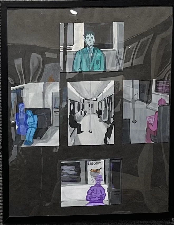 Made with Gouache, these four panel art pieces are made to reflect how each individual plays in our society/world. Although everyone keeps to themselves, either conscious of the distance between each other or listening to music, we all live harmoniously with one another. As simple as a subway, looking at it from afar we would be nothing without another man's presence. That is how the world works. These concepts are reflected through the color relationships and the perspective within the piece.