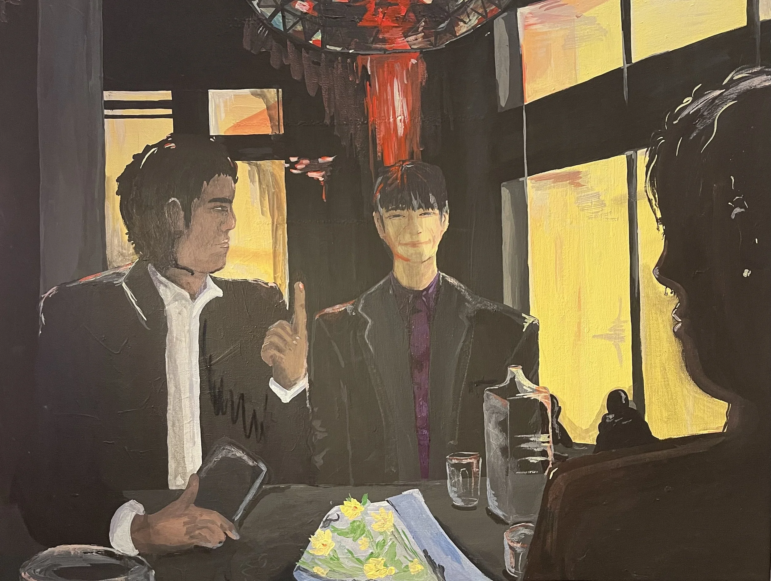 Following the theme, "How humans change over time", using a mic of gouache and acrylic paint, this piece represents key events within an individual's life. This piece takes place during what many think is a key moment in a teen's life, prom . I wanted to showcase the memories of such key events and how people change/grow from such events: the different figures within the picture (both visible and invisible) . Daffodils symbolize new beginnings and revival, hence the bouquet on top of the table.