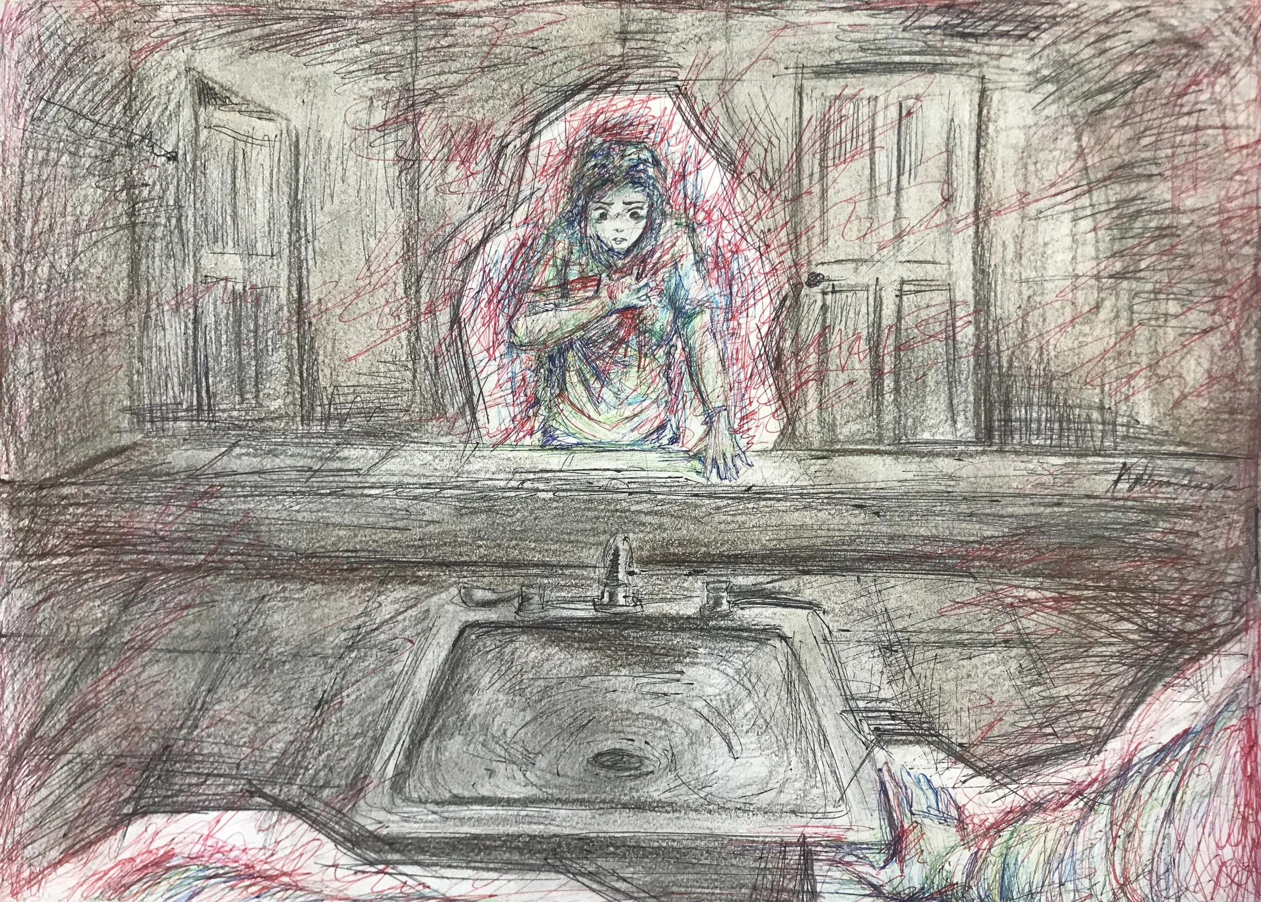 This artwork was inspired by artist Cody James, who was able to manipulate the messy strokes of a ballpoint pen into one coherent drawing. With these strokes representing jumbled emotion, this work evokes a particular kind of shock. The work is in a first-person perspective yet the person’s appearance is revealed in a mirror, offering the audience multiple perspectives on this specific emotion.