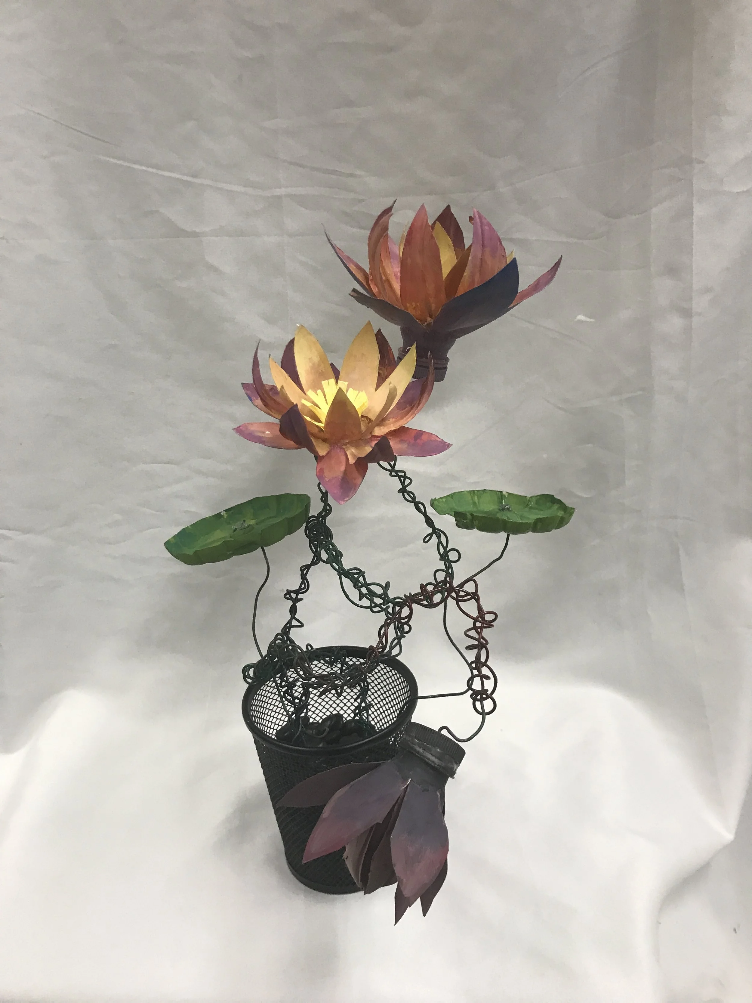 Inspired by Mark Quinn’s use of imperfections in The Chromatic Nurseries of El Dorado (2008), this 3D plant symbolizes the uncertainty and disorder found in recovery from grief. Some lotus flowers struggle to grow upwards, while one wilts away in the process. The lotuses are intertwined with one another, suggesting the idea that the healing process can include both progress and obstacles. -