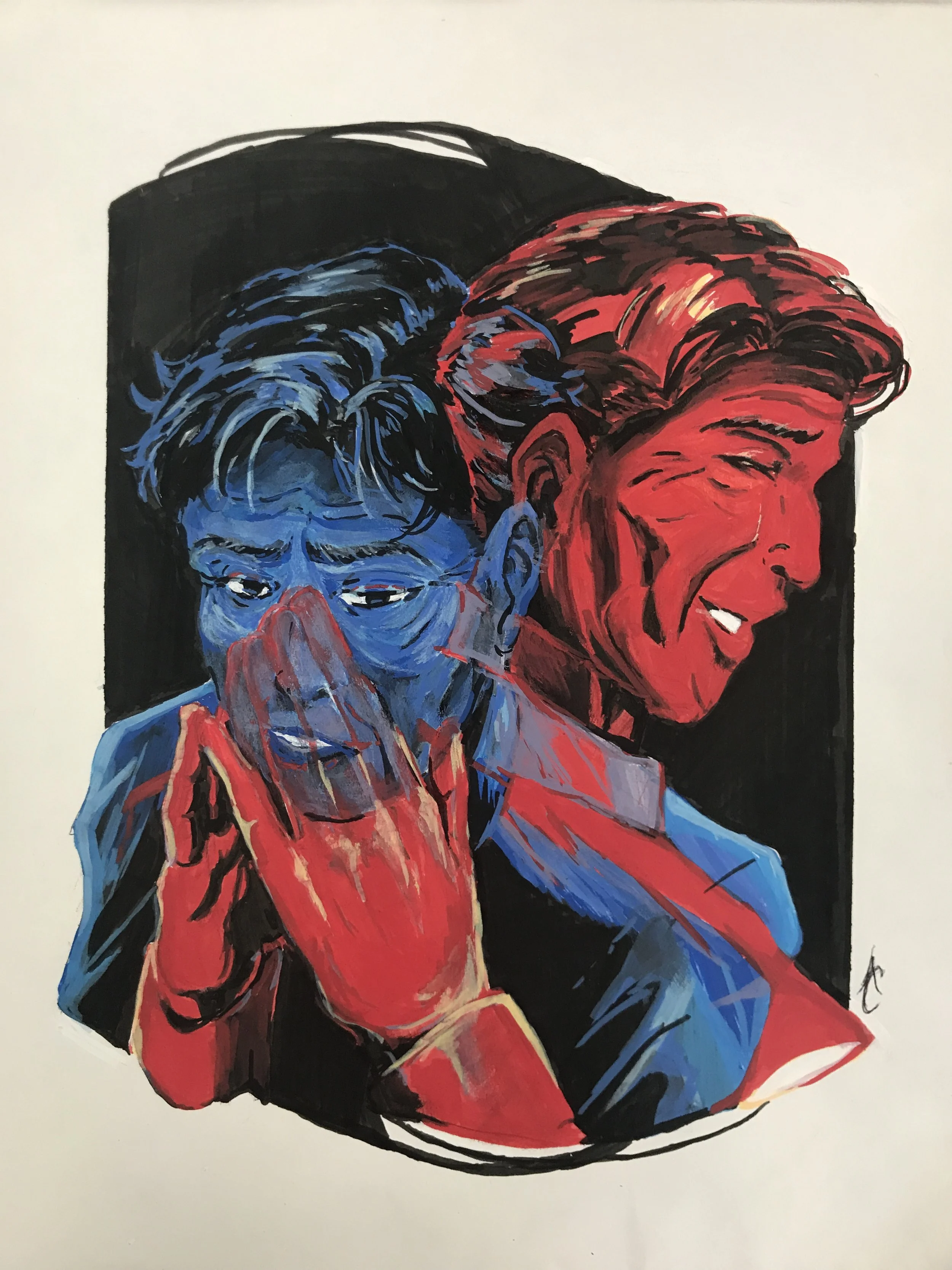 This artwork was inspired by Andrew Tate’s painting, Spectre, and captures two overlapping portraits of the same man, one blue and one red, into one work that changes in appearance through different filters. By incorporating both happy and depressed emotions with this technique, this work reflects the state of denial one may experience in grief.