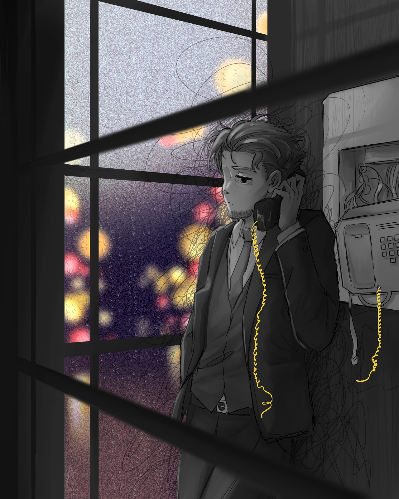 Inspired by Jochen Mühlenbrink’s ability to replicate foggy glass in his paintings, this artwork utilizes a rainy window as a ‘barrier’ between the human and the outside world, depicting a disconnected feeling one may experience in life. The foreground is the interior of a telephone booth and solely takes on neutral tones in contrast to the outside city lights. The man intends to contact someone from the outside with a broken phone but cannot.