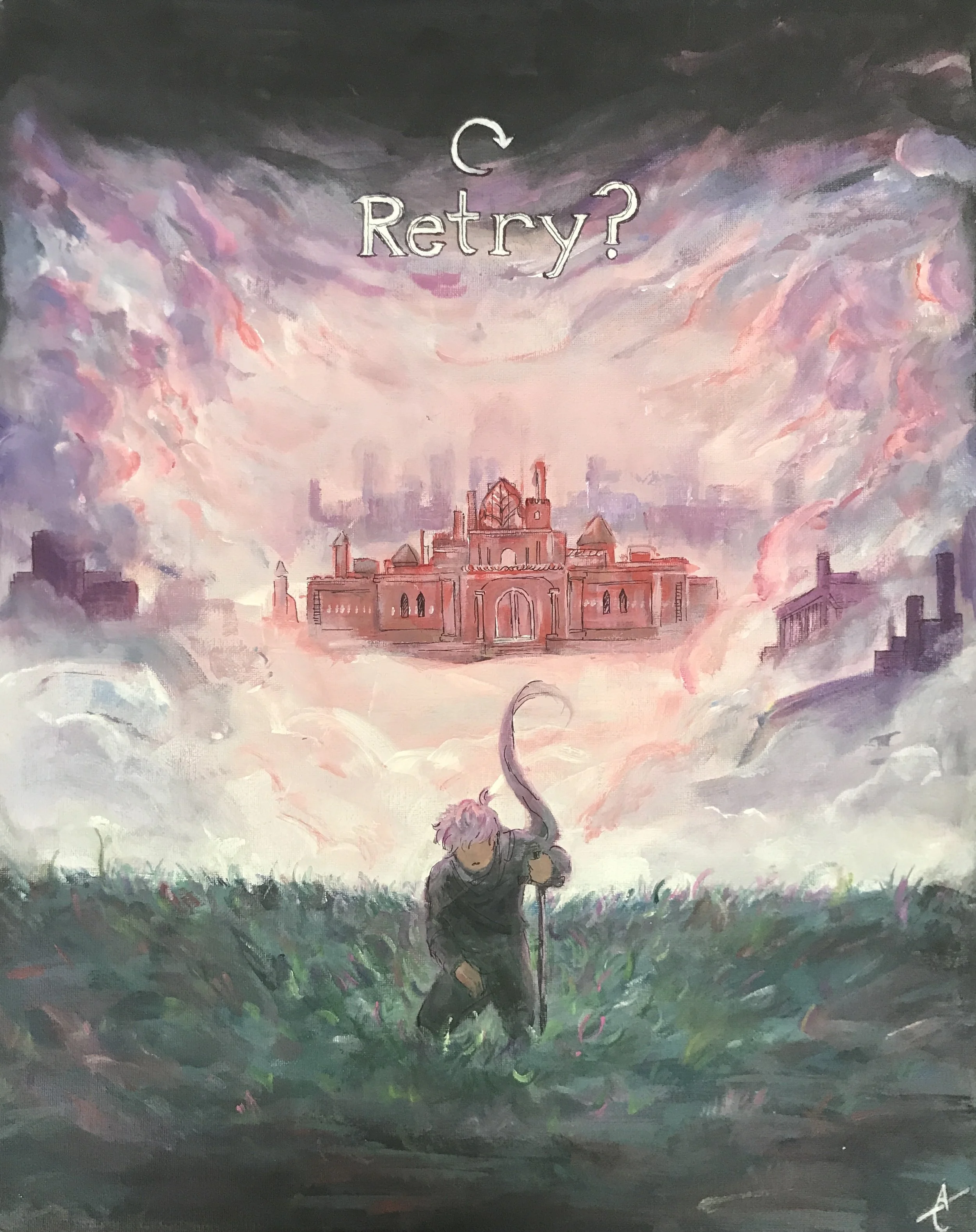 This work was inspired by an artwork from the video game Elden Ring. It intends to mimic a fantasy-themed video game style; a retry button is found at the top of the canvas and there are fantasy-like surroundings throughout. Using this theme, this work depicts the recollection of missed opportunities in the past and the need for a second chance. -