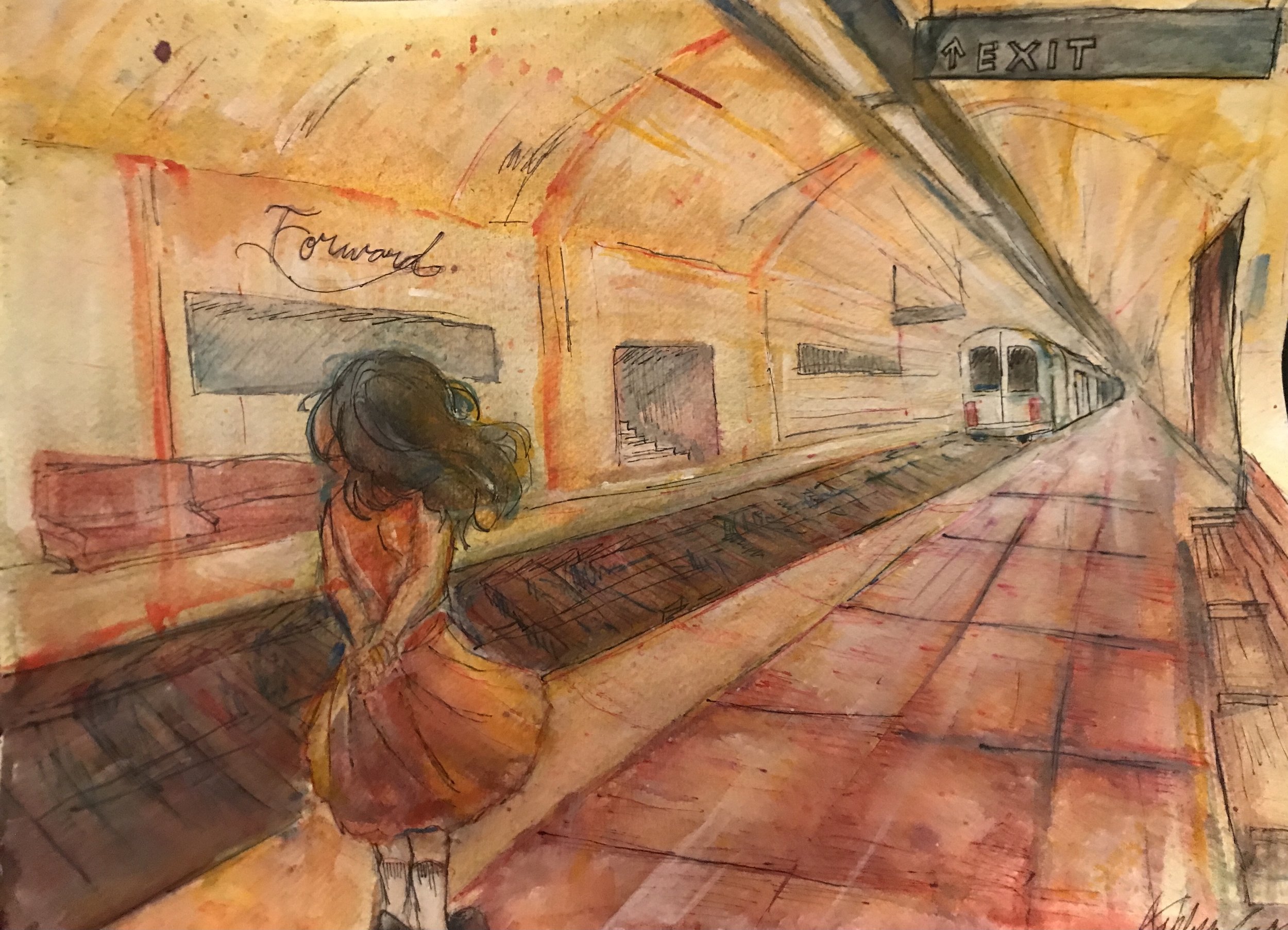 The idea of a subway station was prompted by an unknown creator on social media and means to portray the idea of acceptance when faced with grief. The train symbolizes past events passing by, and a girl is calmly watching it leave the station, representing the act of letting go. Vibrant, warm colors are used to evoke the feeling of comfort.