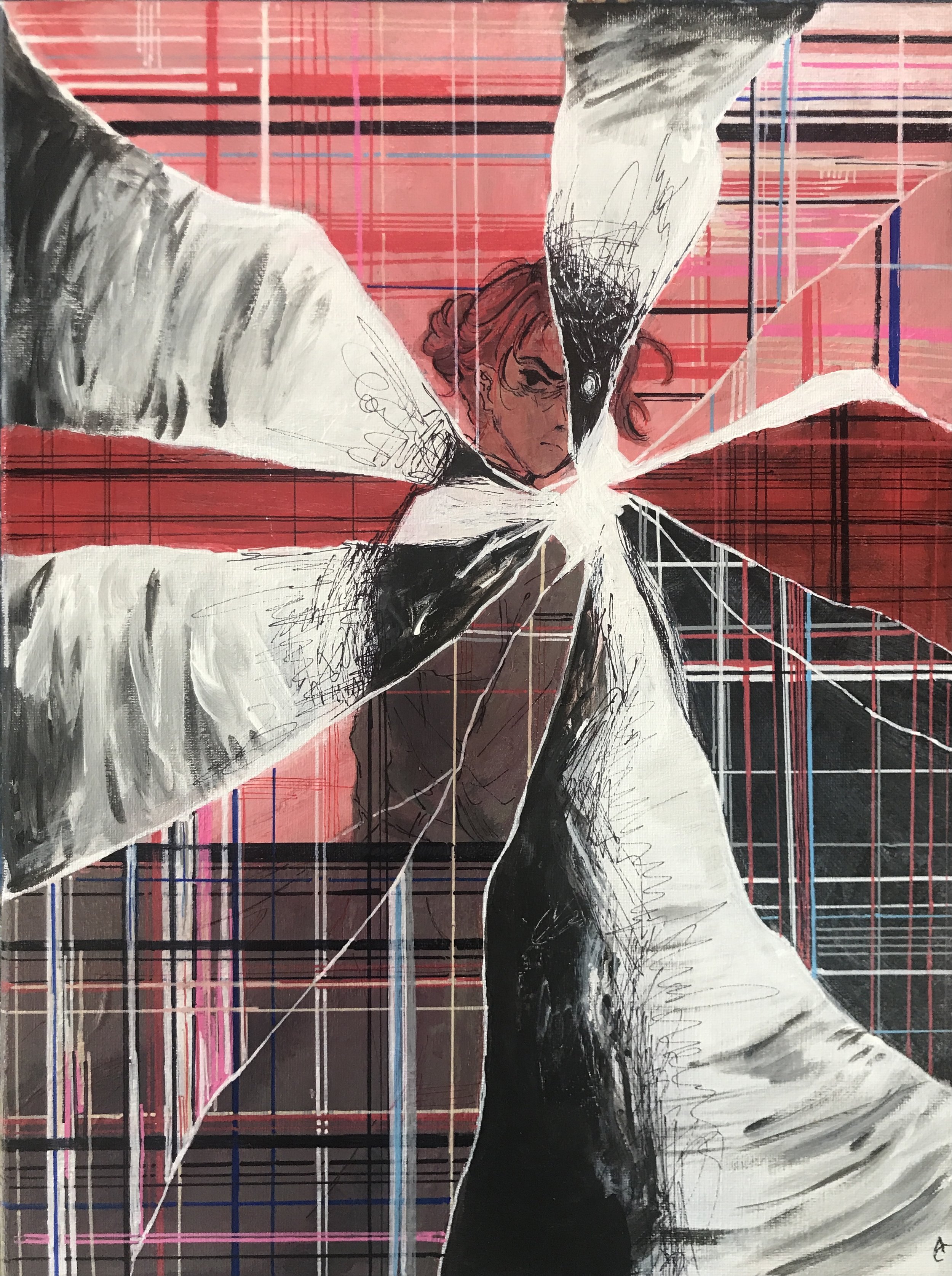 Inspired by the distorted portraits of Lukas Moll, this painting conveys the intense emotion of anger. Similarly, distorted fragments are used in the painting to portray the irrationality of the current state of mind. The overall composition alludes to a broken screen, as if one has punched it in a fit of rage. Bold lines and colors emphasize the intensity of this emotion.
