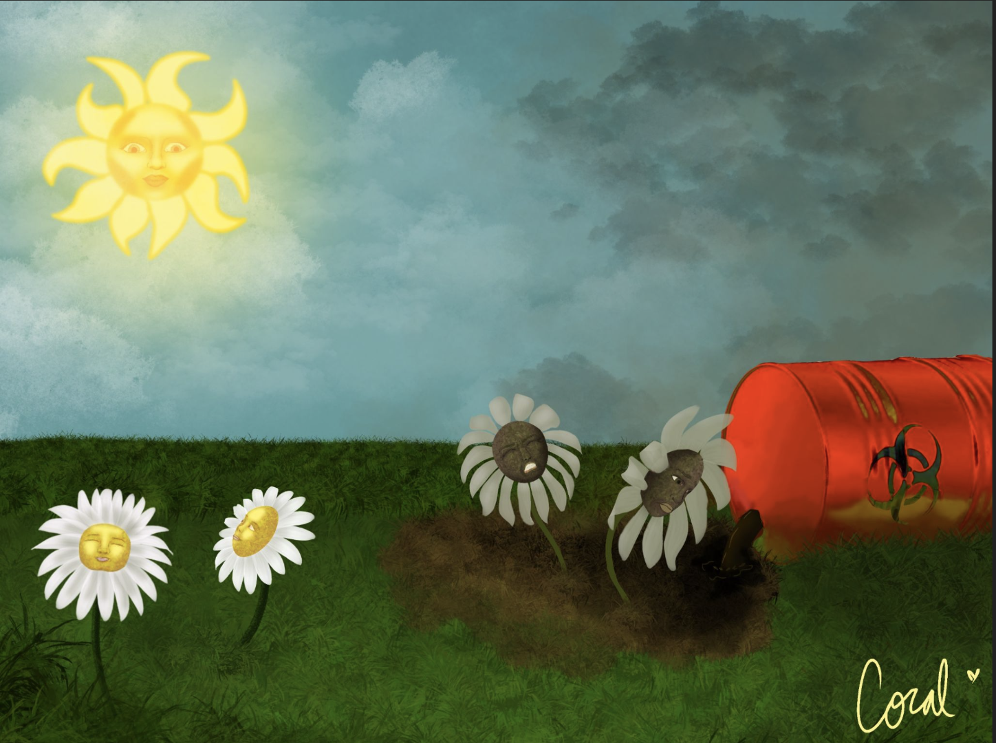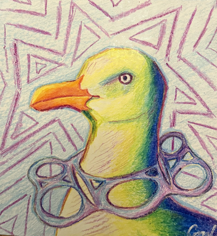 The artwork “suffocation” is about the plastic that litters the oceans and beaches. The animals living there typically end up accidentally eating plastic, which is shown through the entrapment of the seagull within the plastic soda holder. The piece uses the elements and principles of color, value, texture, unity, and contrast to create a bright and whimsical representation of this problem. The color scheme represents the bright plastics and colorful oil spills connected to these environmental issues.