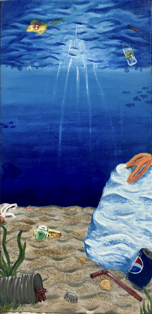 “Ocean Landscape” is inspired by the artwork “Cliffhanger” by Constance Mallinson and her theme of the environment in her art. The painting uses the elements of depth, value, and color, and the principles of balance, movement, and unity. These aspects are used to create a detailed underwater landscape with trash floating around to symbolize the impact of littering on the environment.