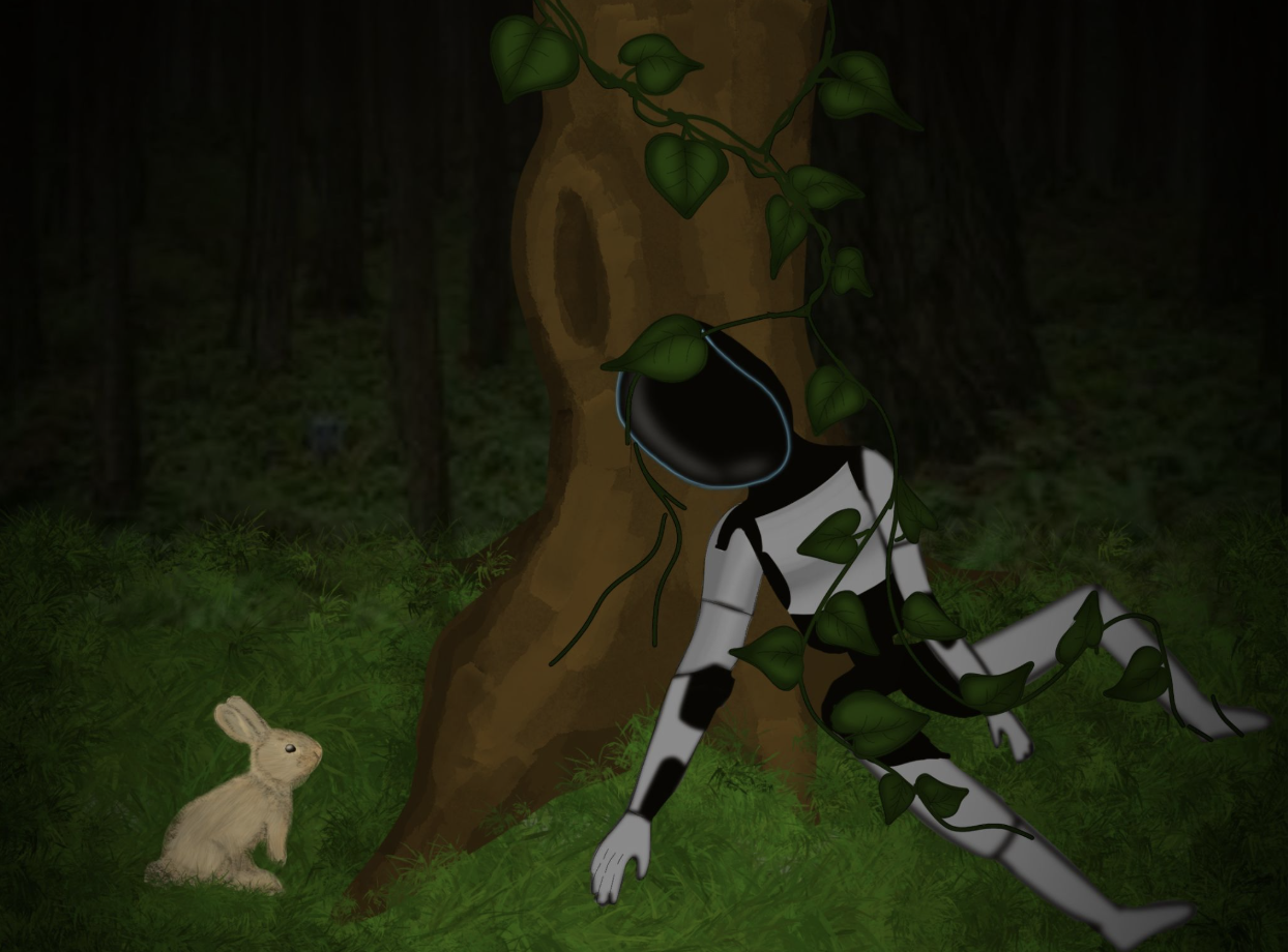 “Second Life” is a piece that depicts a theoretical world where robots take over and the human species dies off. As robots begin to die off as well, Earth is given a second chance at life where nature can bloom once again. This cautionary tale is told through the rabbit, which is observing the dead robot in curiosity and fear. The artwork uses elements and principles such as of value, texture, and space to create a unified piece.
