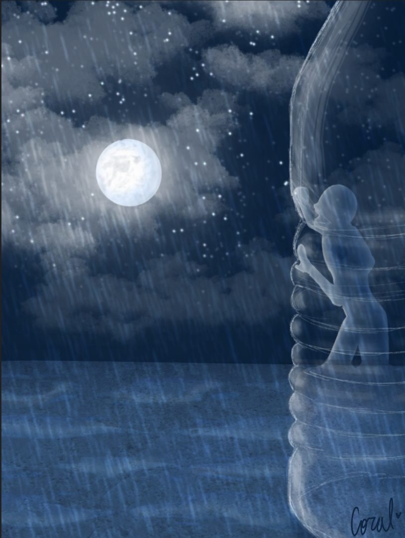 The artwork “Trapped” is inspired by the trapped water theory, which concerns the loss of water from the water cycle that gets stuck in plastic containers. The artwork uses a rule of thirds composition, with the man in the bottle symbolizing the water that doesn’t get to go back into the water cycle. This piece also uses a monochrome color palette of blue, as a way to emphasis the theme of water. The continuation of the natural water cycle is shown throughout the piece with rain, puddles, and clouds.