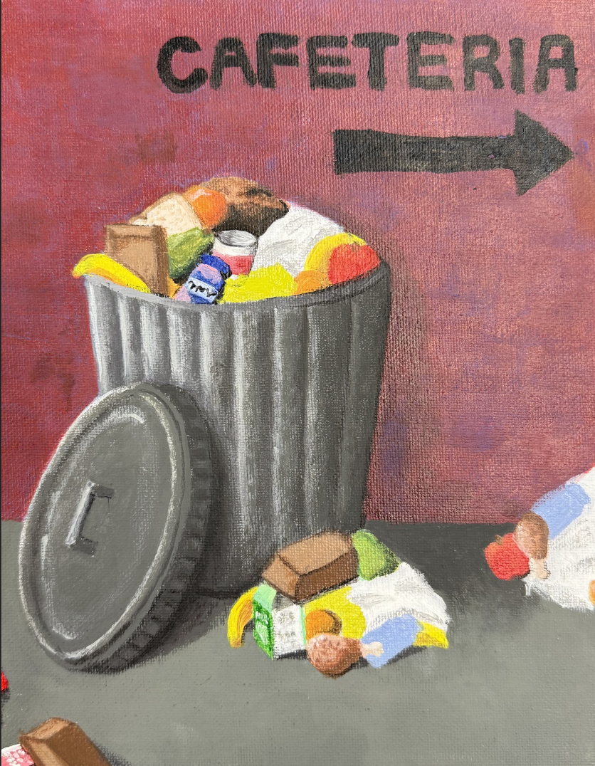“Trash Can” is an artwork that represents the issue of food waste in schools. The trash can is full of perfectly good food, that often goes to waste when kids are forced to take fruits in order to receive lunch. The artwork uses the elements and principles of value, texture, color, and depth to display a semi-realistic display of the subjects.