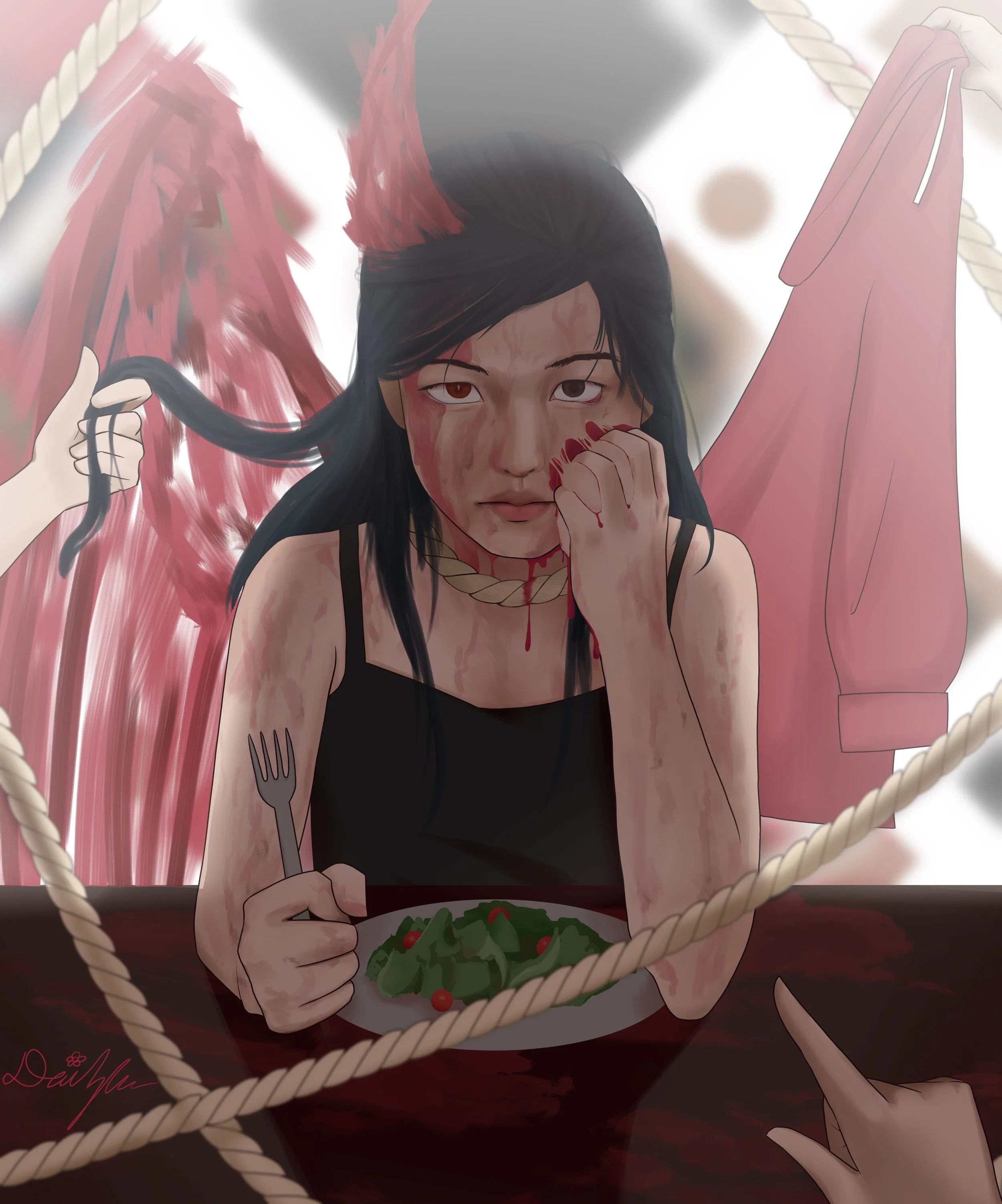 Because part of my theme deals with who we would consider a human, I wanted to depict the violence people are capable of, actions often labeled “inhuman.” Whenever the word “inhuman” is used, its function is to denounce the doer of evil as “one of us people,” which I find interesting because it equates being human to having compassion and incapable of cruelty, despite us knowing that people have been responsible for many crimes and cruelties throughout history.