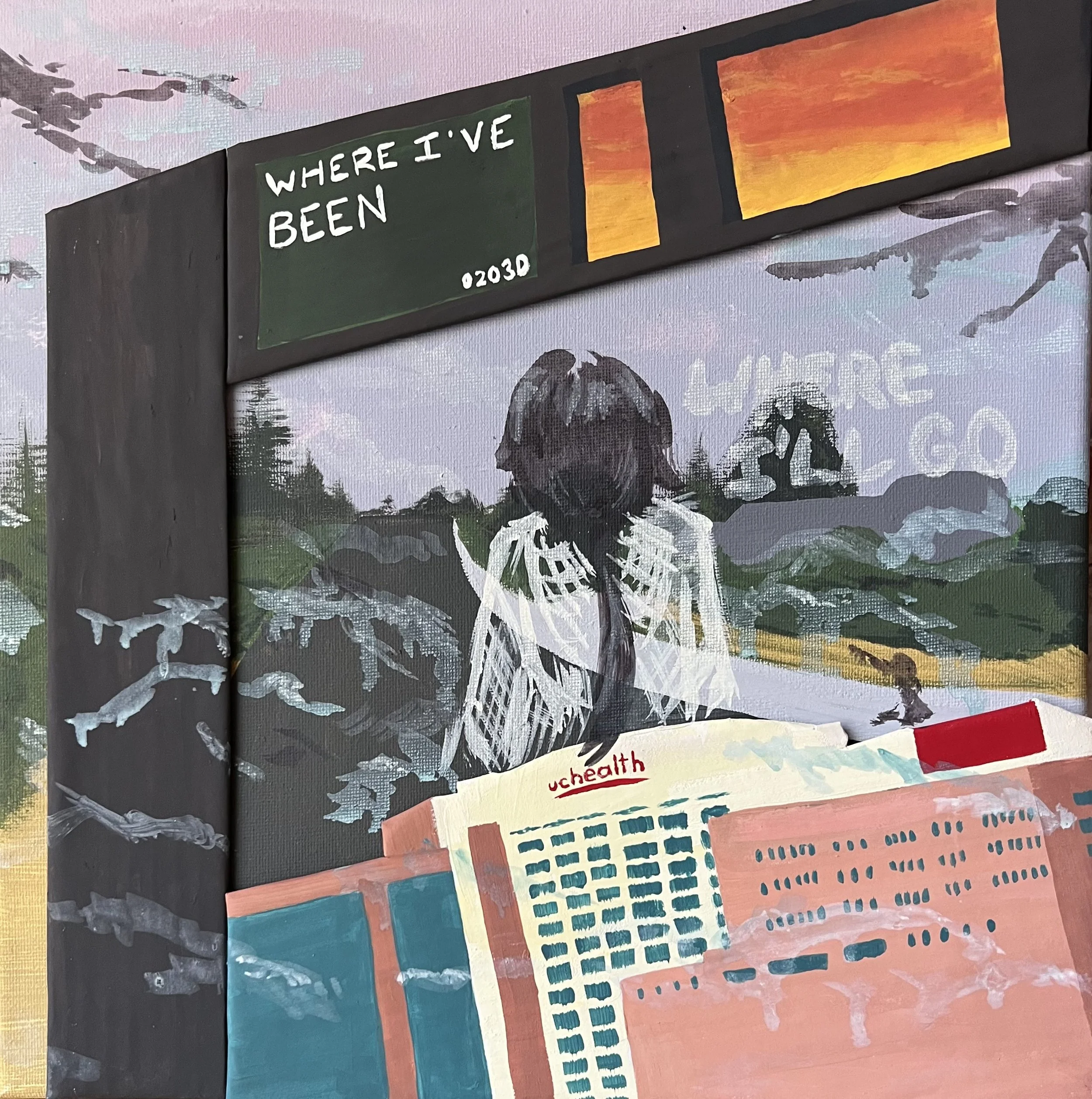 I was inspired by Yang Fudong’s Beyond God and Evil — One loves ultimately one's desires, not the thing desired acrylic on inkjet print to combine several pictures into one piece as well as layer paint on top. I wanted to answer the question “What makes a person?” with “Their past experiences and the dreams they have for the future”, so I used pictures from Denver, the city where I was born, to frame a picture I took outside of my current school with a picture of me looking at colleges on top.