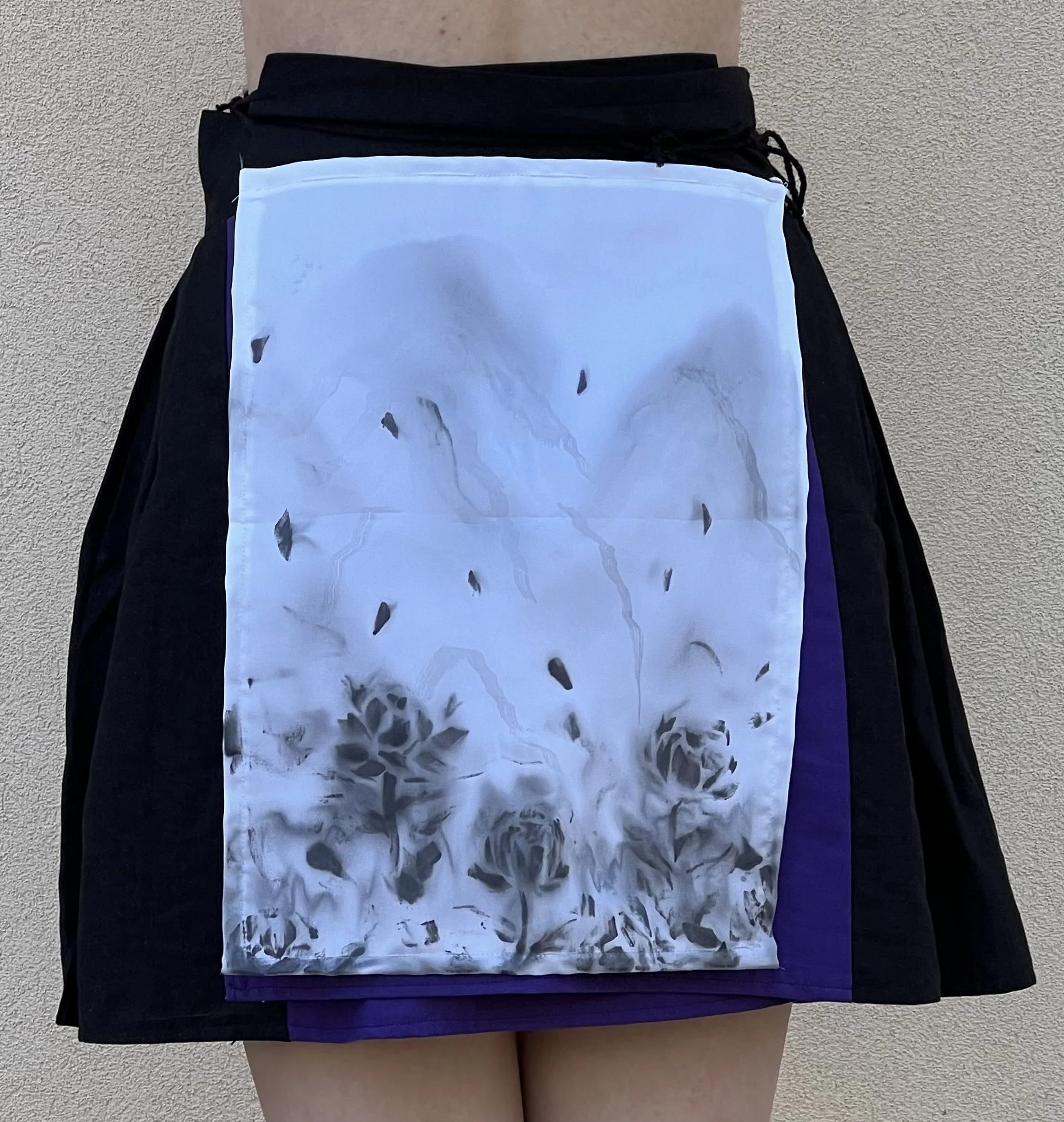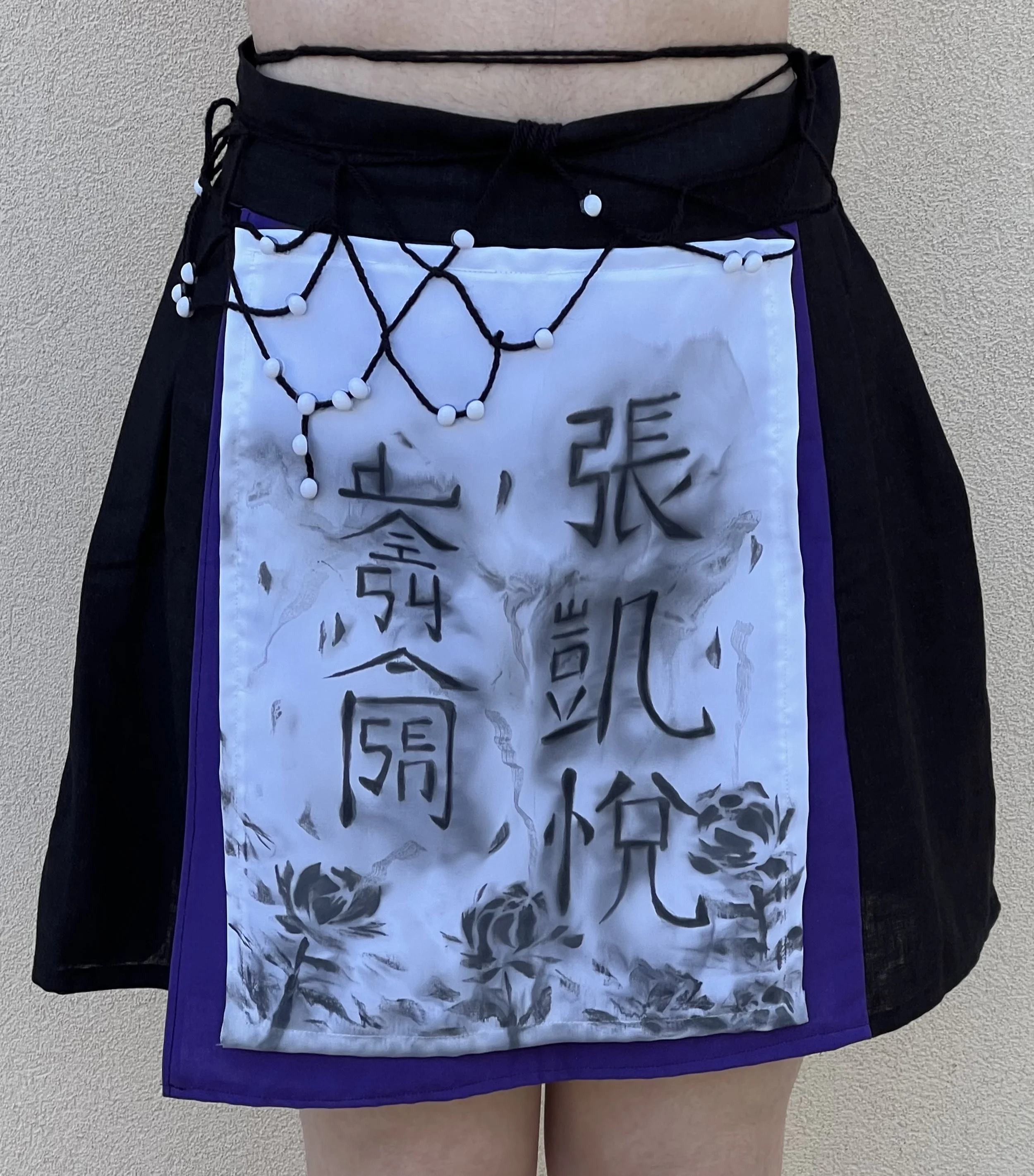 People have their habits and identity shaped by the cultural context they reside within. I can’t create a universal representation of how culture affects people, so I made this artwork to communicate how I have been shaped growing up as an Asian American. The skirt is my own take on a traditional Mamian skirt. I did some calligraphy in the style of Xu Bing’s Square Word Calligraphy because I found it interesting how he chose to represent the confusion between cultures.