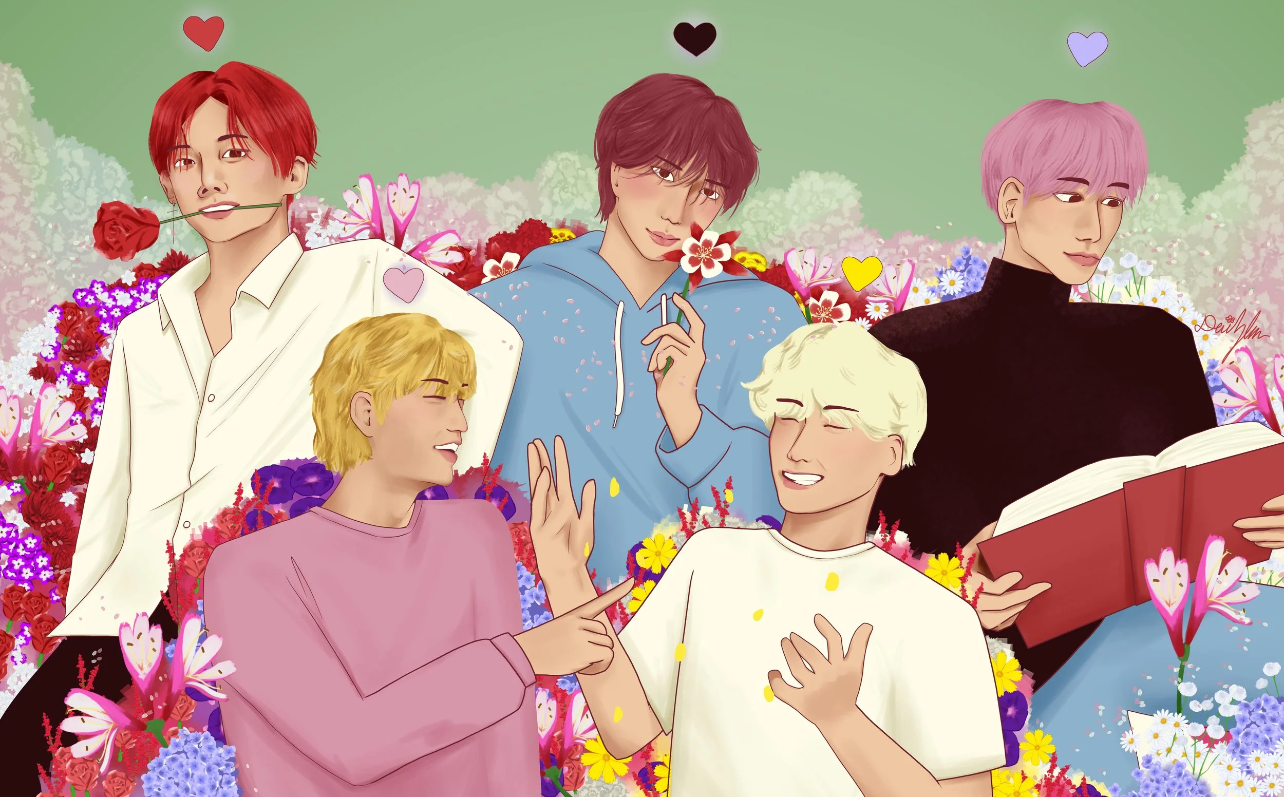 Each person’s life is shaped by the relationships they have formed around them, so I wanted to create an artwork that represented relationships through personifying the 5 types of love that I selected out of the 7 Ancient Greek types of love: Eros, Philia, Ludus, Pragma, and Mania, which are romantic love, brotherly love, playful love, practical love, and obsessive love respectively. I also incorporated different flowers with suitable flower meanings surrounding each of the types of love.