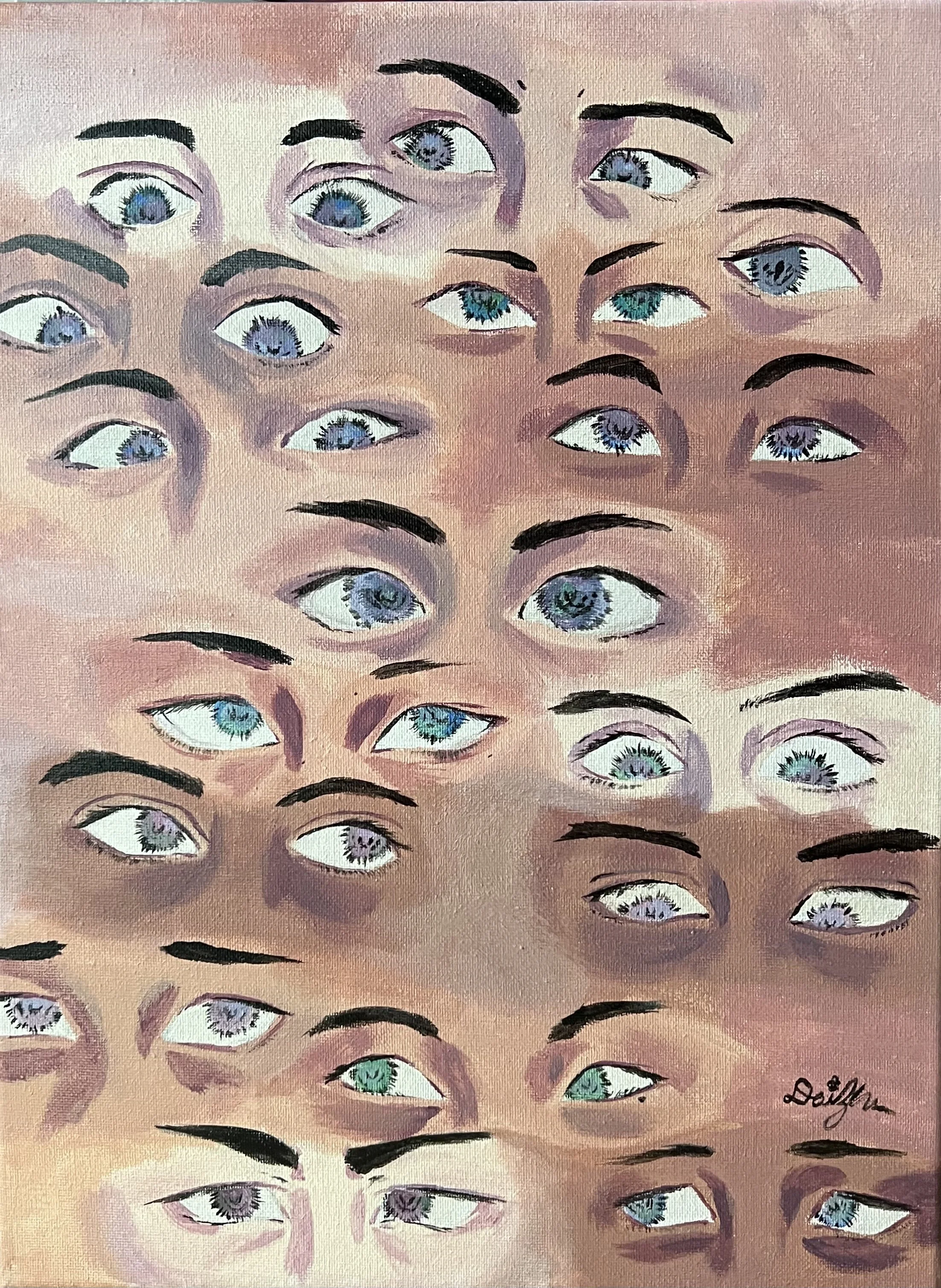 I wanted to express how one way people are shaped is through the way people view the world. I painted eyes because they symbolize sight and included different expressions and different features from several different people around me to explore the variety of different worldviews and resulting personalities that can be found in one small area. Also as a part of conveying this, the mix of colors in the irises is unique to each pair of eyes.