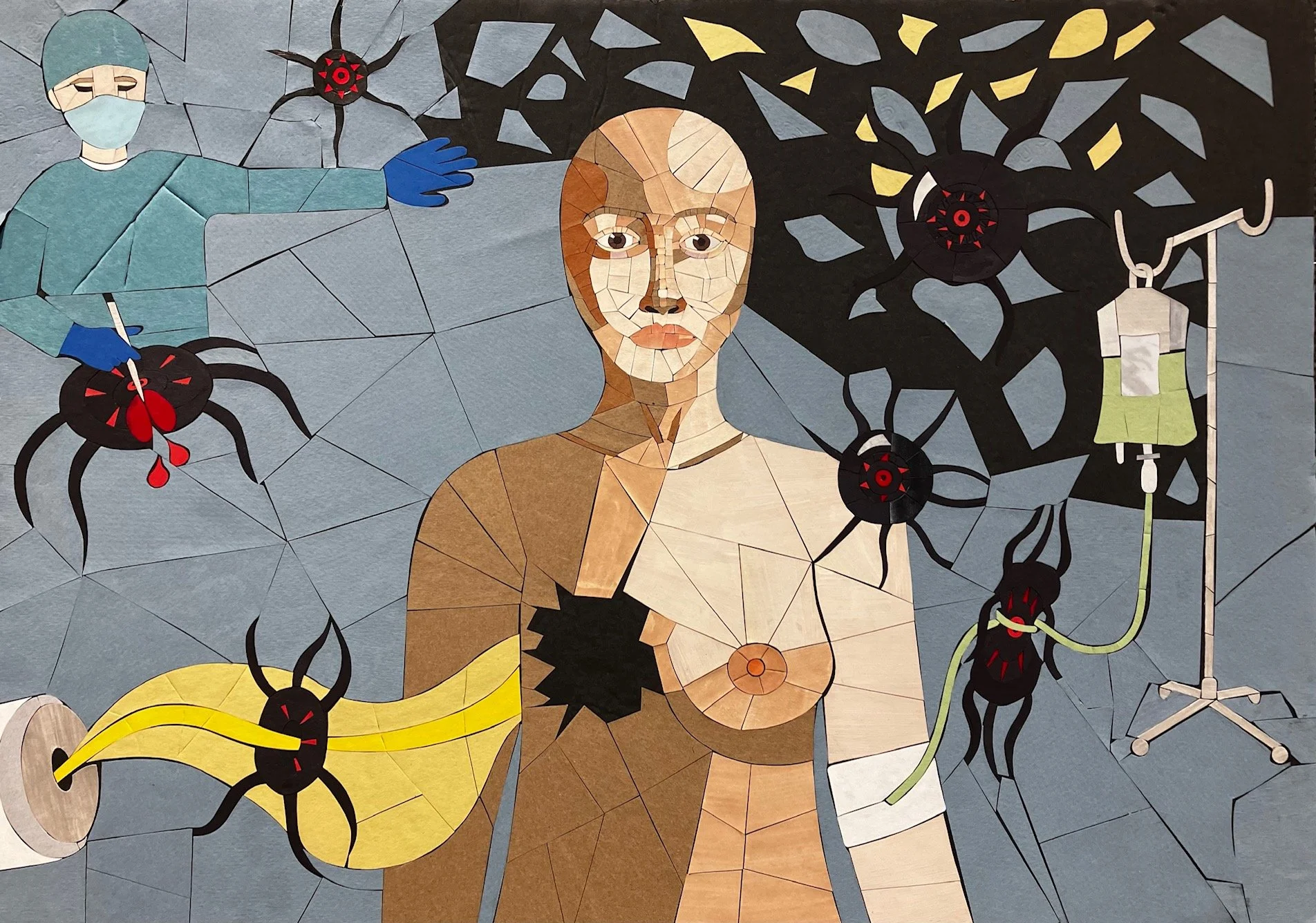 This artwork acknowledges the available treatments for cancer (specifically breast cancer) that have been made available through decades-long research and experimentation. The paper mosaic represents the devastating effect of the life-altering diagnosis of cancer. The main treatments for cancer, which include radiation, chemotherapy, and surgery, are included in the mosaic. It is because of tireless advancements in science that we have been able to prevent cancer from taking more lives.