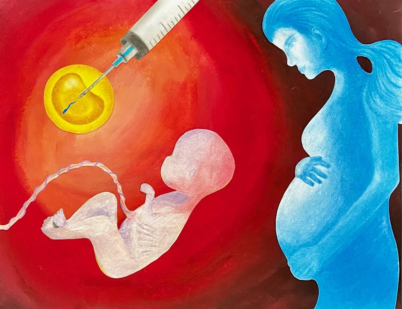 With this piece, I wanted to illustrate the process of in vitro fertilization on a scientific level in comparison to its effect on humanity. The process of inserting a sperm cell into an egg cell is depicted in bright yellow to bring attention to the topic of the work. The red background represents the interior of a womb, where life starts. The presence of the syringe symbolizes the science that will allow the woman depicted in blue to finally be a mother to the baby in the center of the work.