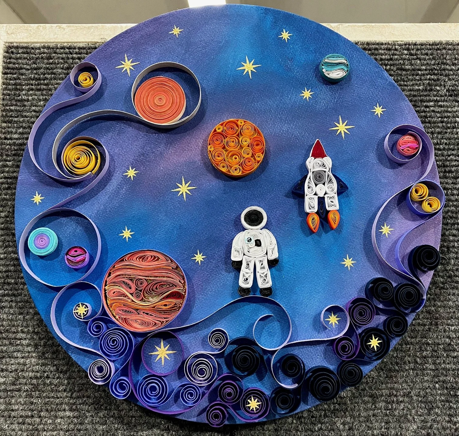 This piece illustrates the possibilities made available by innovation in space travel. Man first landed on the moon decades ago. Numerous advancements in technology have been made since that time, allowing mankind even more possibilities concerning what we can learn about what lies outside of earth. This piece employs paper quilling to capture the planets and other astronomical objects that could become accessible to humans in the future.