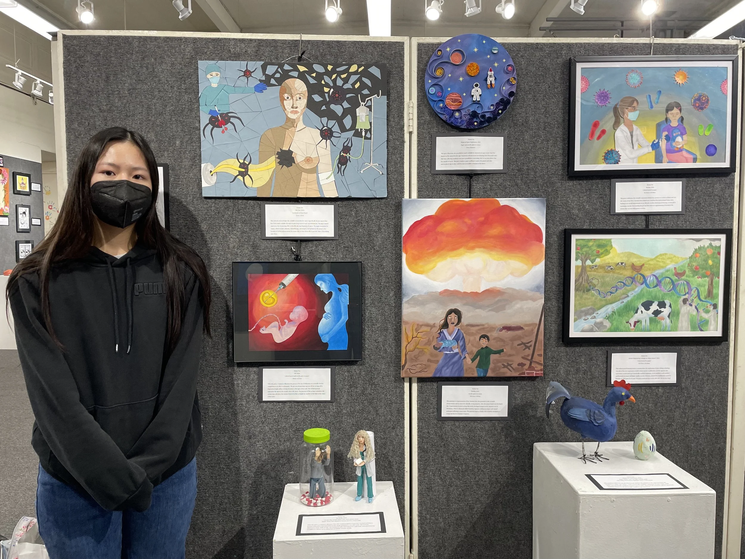 I tried to arrange my works in a way that was both visually and conceptually balanced. The Hiroshima painting is the largest in size and the only vertical painting. Furthermore, the atomic bomb is extremely bright and draws the eye. Therefore, I placed this painting in the center of all the works. Above this, I placed the space travel piece because this is the smallest piece in the collection, and if it was placed elsewhere, the display appeared unbalanced. Furthermore, because the piece is about space travel, I thought placing it at the highest point would be suitable. Following this, I placed the IVF piece to the bottom left and the genetic engineering drawing on the bottom right so that there would be visual balance between the dark colors used in these pieces. Then, I placed the breast cancer piece on the top left and the vaccination drawing on the top right. Both of these pieces have roughly the same saturation and visual weight. Lastly, I placed the two three-dimensional pieces on display stands equally distant from the center. Both of the three-dimensional artworks are roughly the same size, so placing one on the right and one on the left side maintained the visual balance of the exhibition. As I was arranging these pieces, I also made sure to stagger the pieces celebrating science with the pieces that are less positive. I briefly considered dividing the celebratory pieces from the negative ones but ultimately felt that this was visually imbalanced and gave the impression that science was strictly good or bad. As the audience views my body of work, I hope for them to be able to compare and contrast each piece with the others, acknowledging different ways science has impacted humans positively, negatively, or questionably throughout time. My goal is for viewers to ultimately come to their own conclusions on each of the topics represented by each piece and form their own opinion on how science as a whole has shaped humanity today, as well as how science will eventually shape the future.