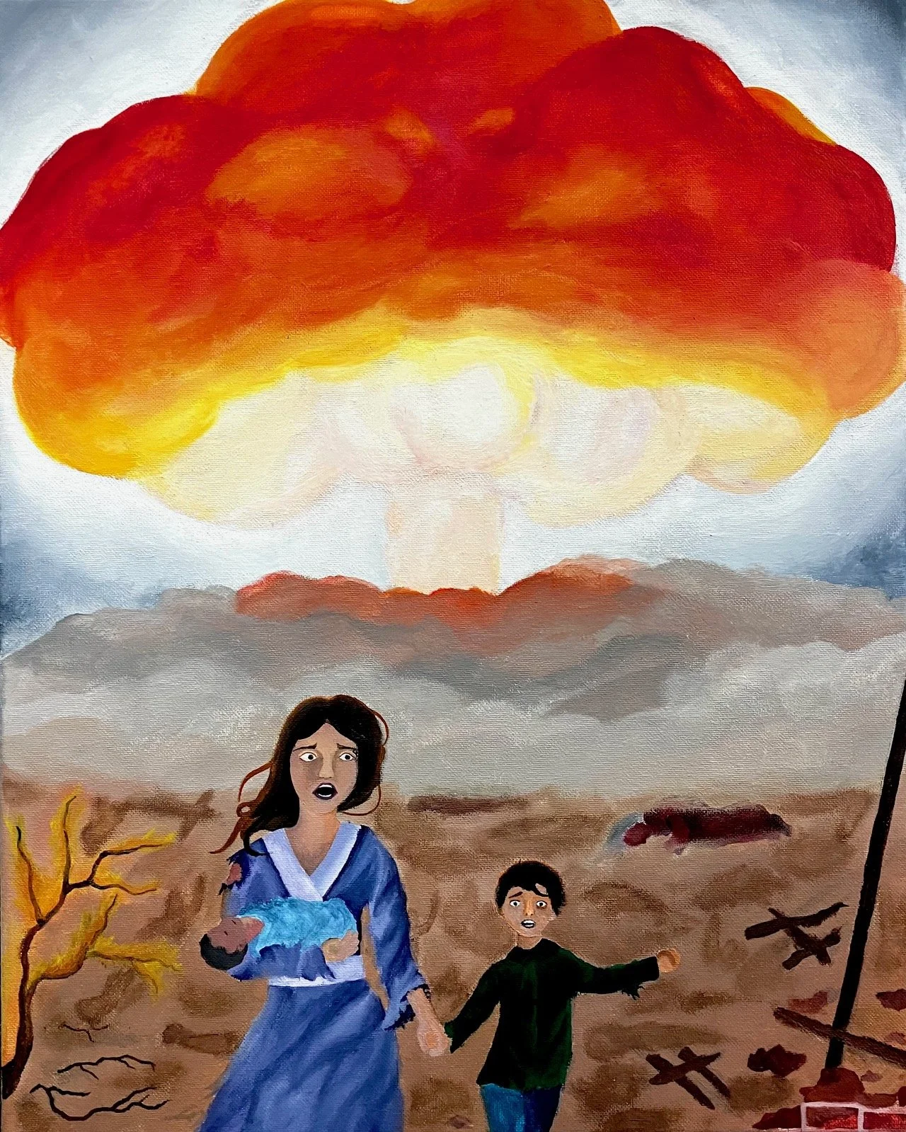 This painting is a representation of how humans have the potential to take scientific advancements and use them for ethically wrong purposes. After the atomic bomb was developed, the US government decided to drop this newly developed weapon on the Japanese city of Hiroshima, where it ultimately killed countless Japanese civilians on impact and caused prolonged suffering to many more. The painting depicts a family who is futilely attempting to escape the horrors of atomic weaponry.
