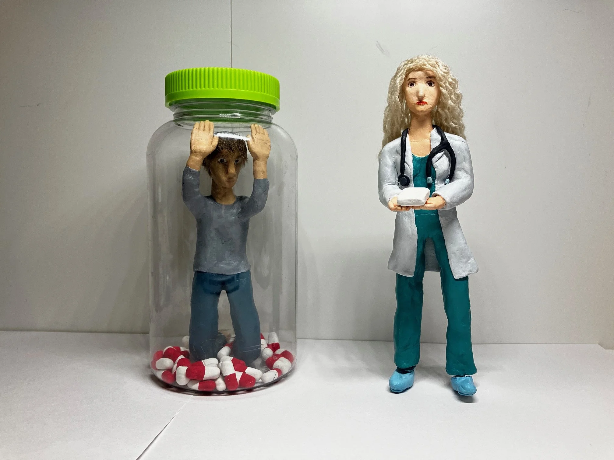 With this piece, I wanted to illustrate how the overprescription of narcotics can lead patients to become addicted to and dependent on the drugs intended to ease their pain. The artwork illustrates a man, made of clay, surrounded by pills and trapped in a pill bottle. Detached from his struggles is a doctor, prescribing him an infinite amount of pills.