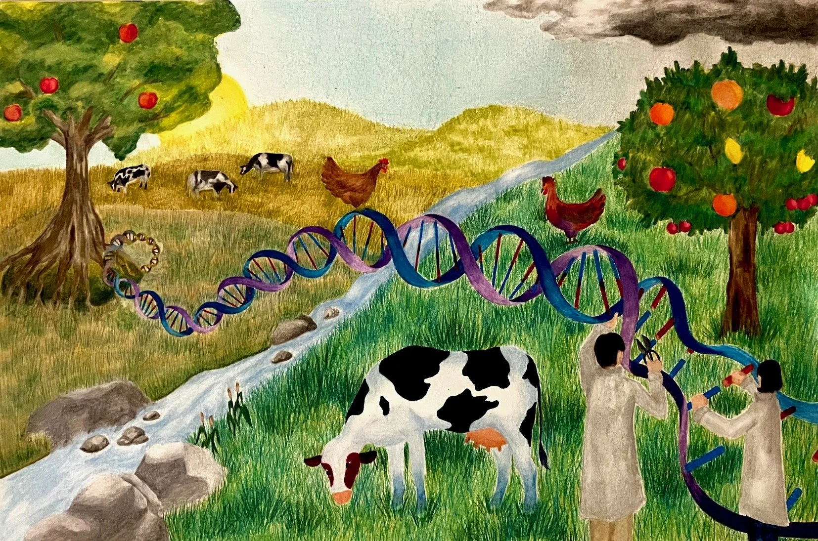 This colored pencil drawing issues a warning about the implications of gene editing technology. One side of the river represents a world without genetic modification, and the opposite side represents a world made up of genetically modified organisms. In the modified world, produce and livestock are larger and higher quality for now. However, should DNA modification extend to humans, at what point do we stop? The grass seems greener on the other side, but for how long?