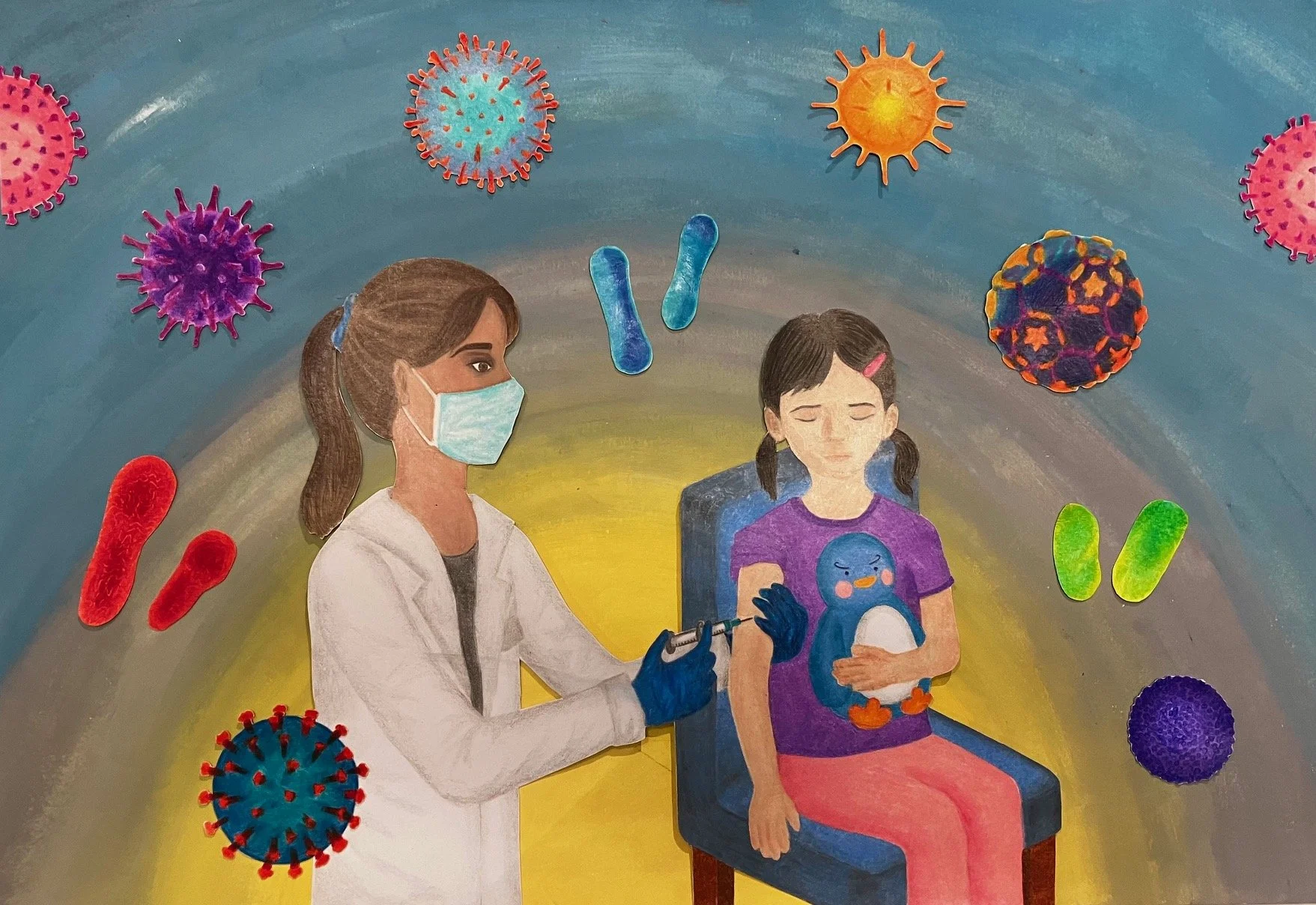 This piece celebrates the scientific innovation behind the vaccines we receive as infants and over the course of our lives. Vaccines have helped save countless lives and prolonged many more, leading to an overall improvement in our lifestyle. In this colored pencil drawing, a young girl is receiving a vaccine. Surrounding the girl and the nurse are representations of several of the viruses that vaccines help protect us from.