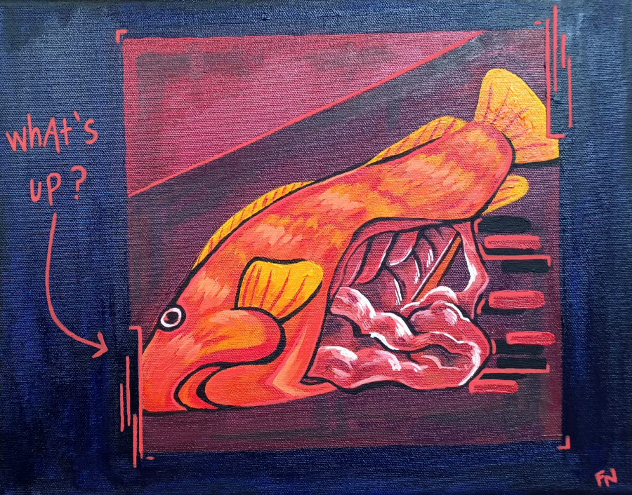 This gutted fish, inspired by Georges Braque’s pre-Cubist works, is steeped in normalization and nonchalance about traumatic situations. Spilling organs indicate severe damage. However, red and black bloodstains, the lasting effects of the injury, remain abstracted and unclear. A sardonic annotation—”what’s up?”—lines the side, annotated by a bystander. What lasting traumatic symptoms have we repressed? What is our brain protecting us from? What’s up with you?