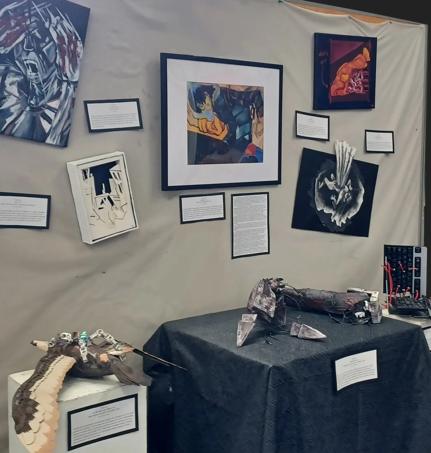I thought the best way to represent this was to play with the orientations of each piece and place artworks in a way that pulled the viewer to each corner equally. The tilted nature of each 2D work suggests the display has been through something, shaking it and decreasing the stability. I placed Splinter in the middle, as the figure is being drawn to various forms and parts of loneliness placed around it. Color is balanced across the exhibit, giving equal weight to each piece.