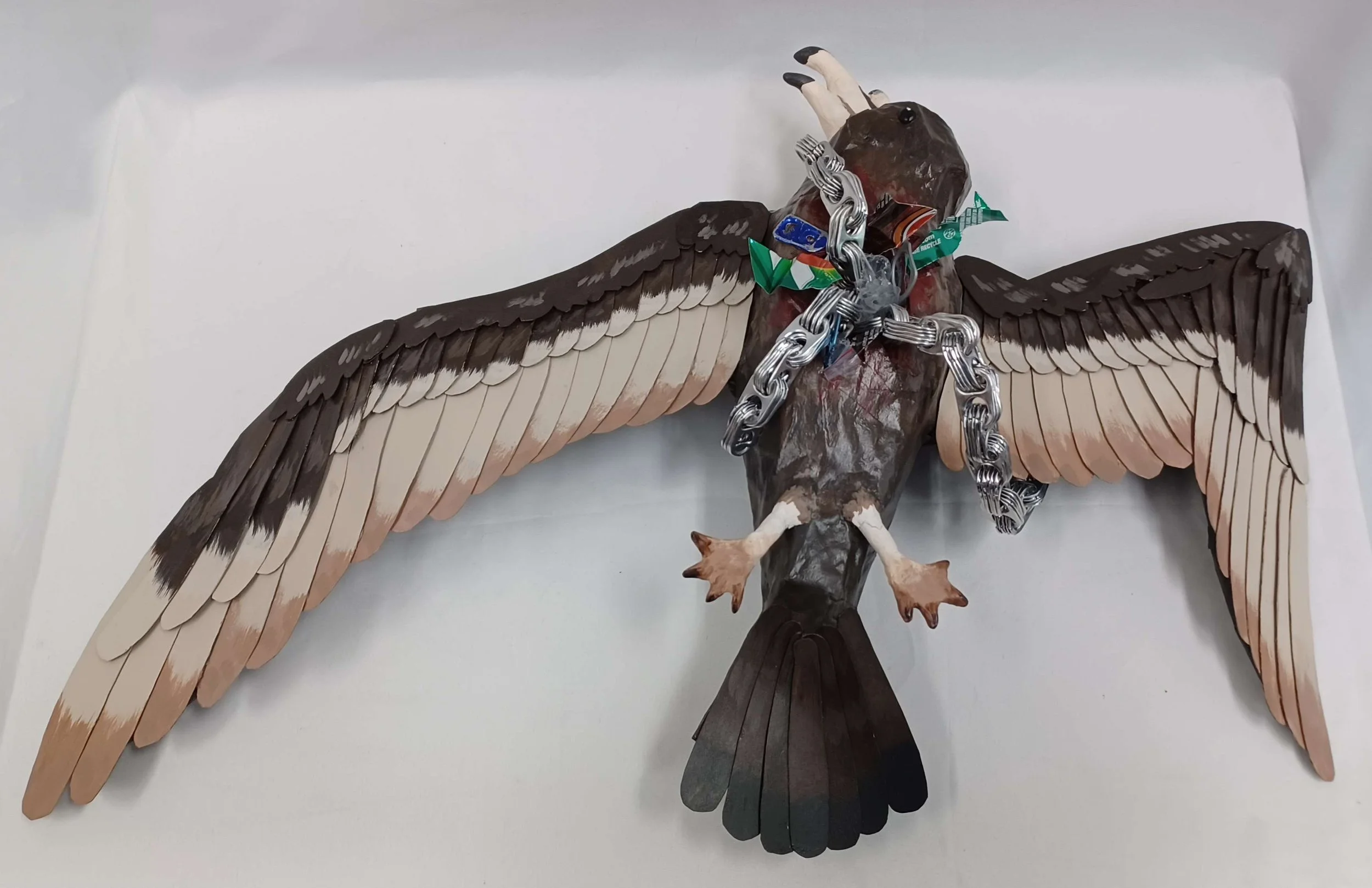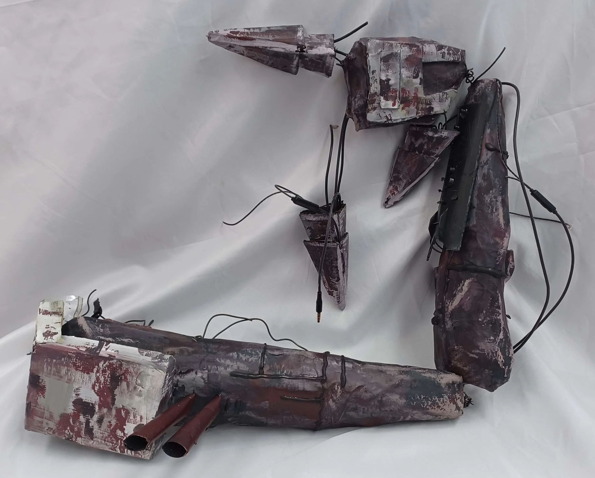 Paper mache, acrylic paint, wires, plastic, metal