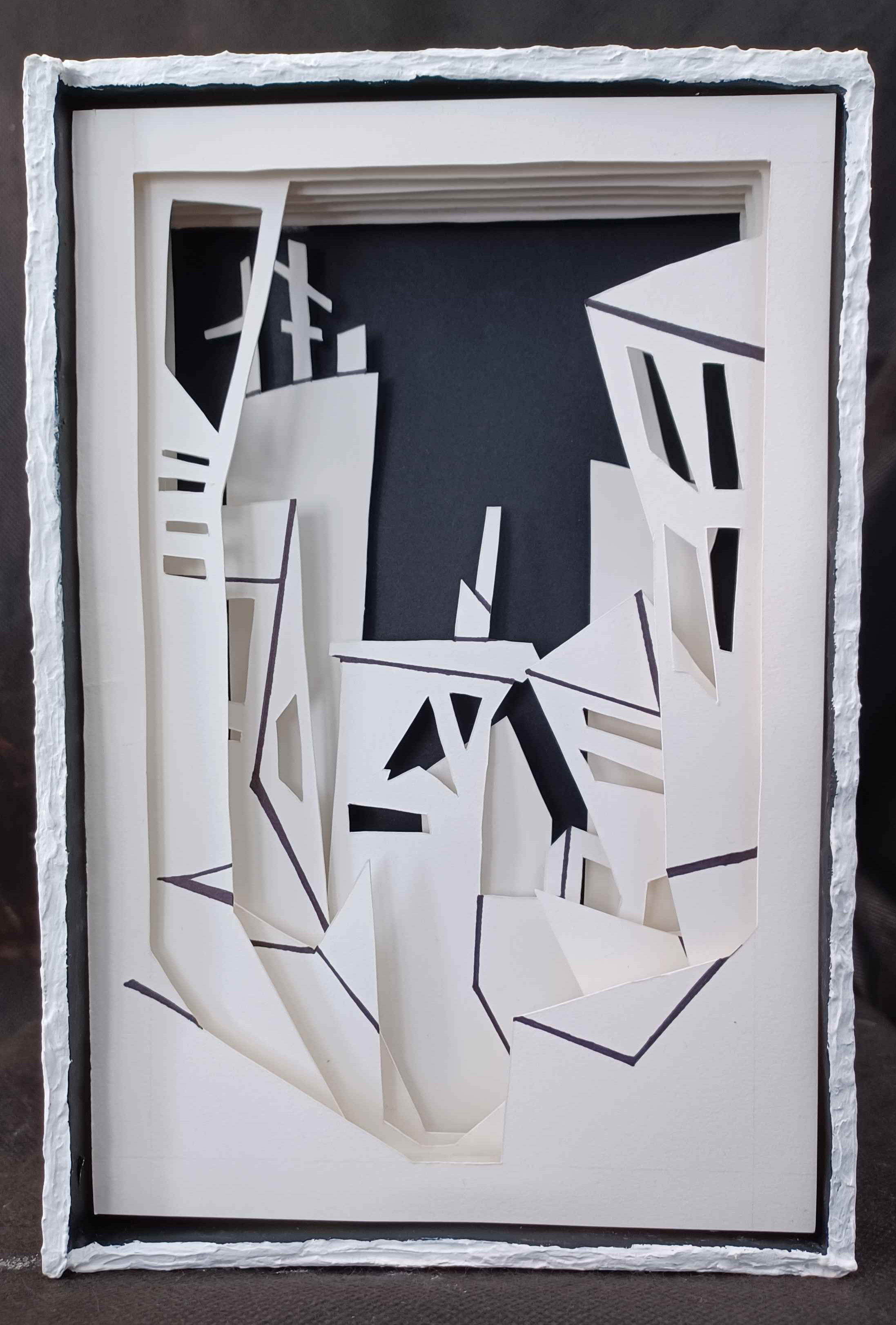 A twisting, angular cityscape (taking notes from The Cabinet of Dr. Caligari) enmeshed with contrasting black lines hides within a uniform box. Layers of cut paper create conflicting perspectives of the world, with a clinical detached tone established through lack of color. The skyscrapers stand distanced, unconnected, and solitary. A quiet yet uneasy solitude creeps in—loneliness, lack of community, and an undercurrent of unseen conflict.