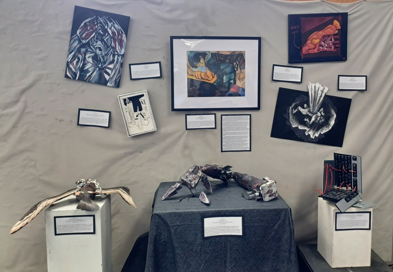 My exhibition is about vulnerability and repression. It confronts the shame and embarrassment felt when asking others for help and approaches the emotional depths a human can spiral towards: alone, helpless, and too afraid to reach out for support. This collection of artwork chronicles my own struggles with mental health and the reluctance I felt towards sharing it with anyone. After so much time shoving my emotions and experiences into the ground, the thought of displaying it in such a public way scares me. I hope my exhibit can bring you, the audience, to your lowest emotional points, so you can connect with my artwork and share that helpless feeling.