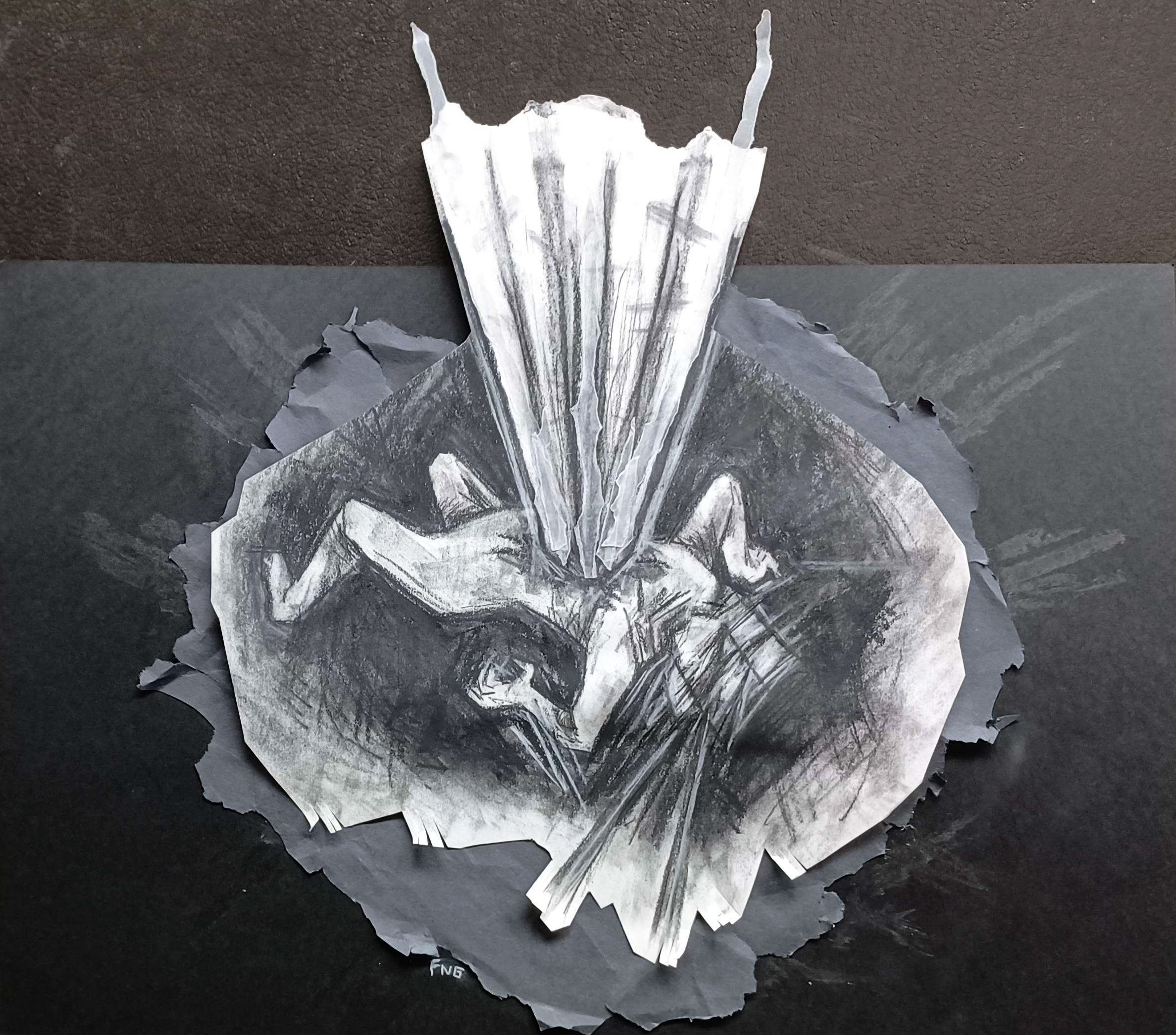 Aggressive scribbles of charcoal, inspired by Käthe Kollwitz's Sharpening the Scythe, communicate agony and movement. Features are blurred together with scratchy textures and visible paper grain. The figure is helpless and alone, thrashing against an unknown presence. Darkness encases the figure and pierces their chest, spilling light. Translucent paper and layering elevates the figure to a higher plane of existence.
