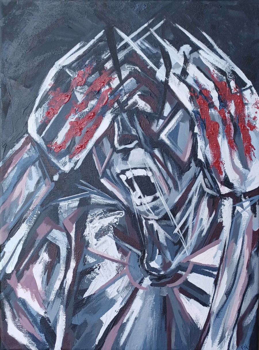 To have a panic attack is to have and be a burden. Rough brushstrokes and slathered grays whip frenzying thoughts into a flurry of tingling fingertips, heavy breathing, heaving shoulders— too much to handle, too embarrassed to ask for help. The taut face, borrowed from Munch's Scream, remains unanswered. A sparse color scheme forces the viewer to focus on the uncontrolled streaks of paint which create unpredictable motion.