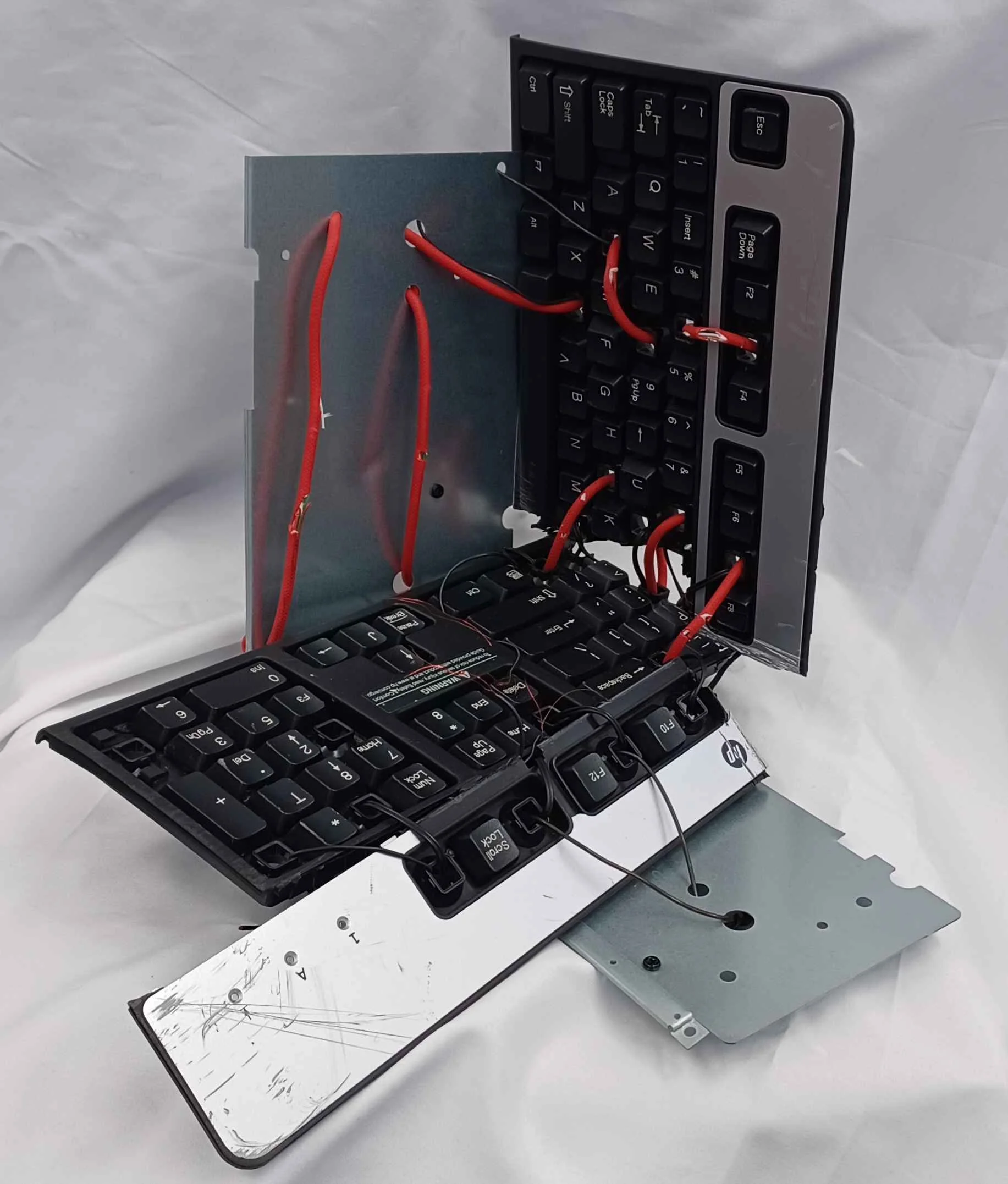 Cold limping machine is presented in the form of a mangled keyboard twisting upon itself. Disrepair is evident from its haphazard wires, jagged edges, and misplaced keys. A history of pain is told through scratches and cuts littered along its plastic. Wire weaves through its injuries to stitch it together, attempting to heal without anyone's help. Maybe this isn't so bad. Maybe the scabbing over alone is less painful than reaching for someone else to do it for you.