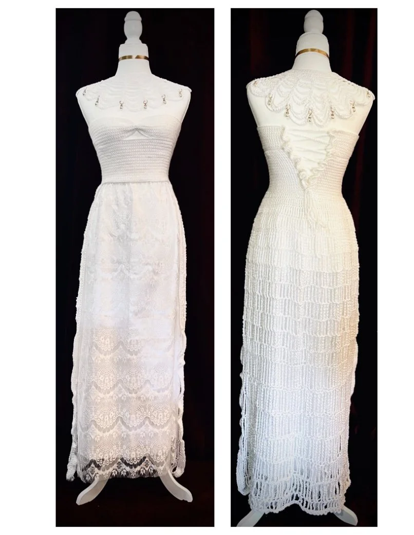 I devoted a month to crafting this piece, employing various crochet techniques such as consistent single and double stitches. Drawing inspiration from my aunt's expertise as a seamstress, I layered two fabrics, lace and satin, to create a floor-length skirt with an elastic band that accentuates the waistline. To enhance its overall appeal, I crafted a corset to enhance the garment's silhouette.